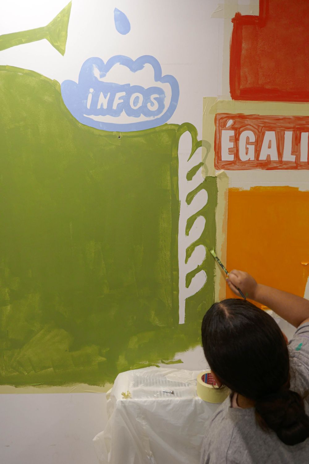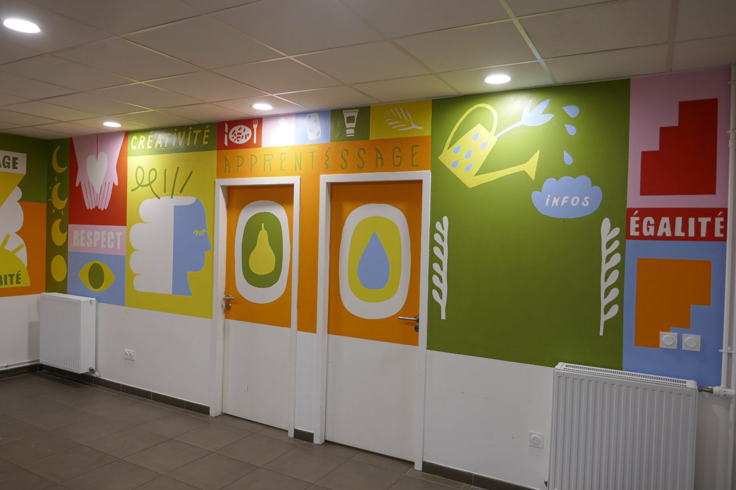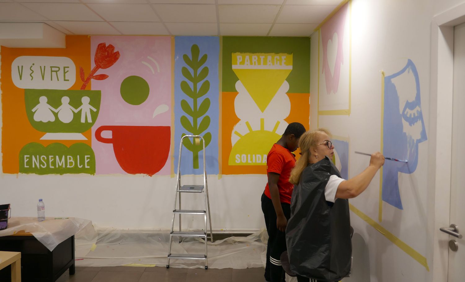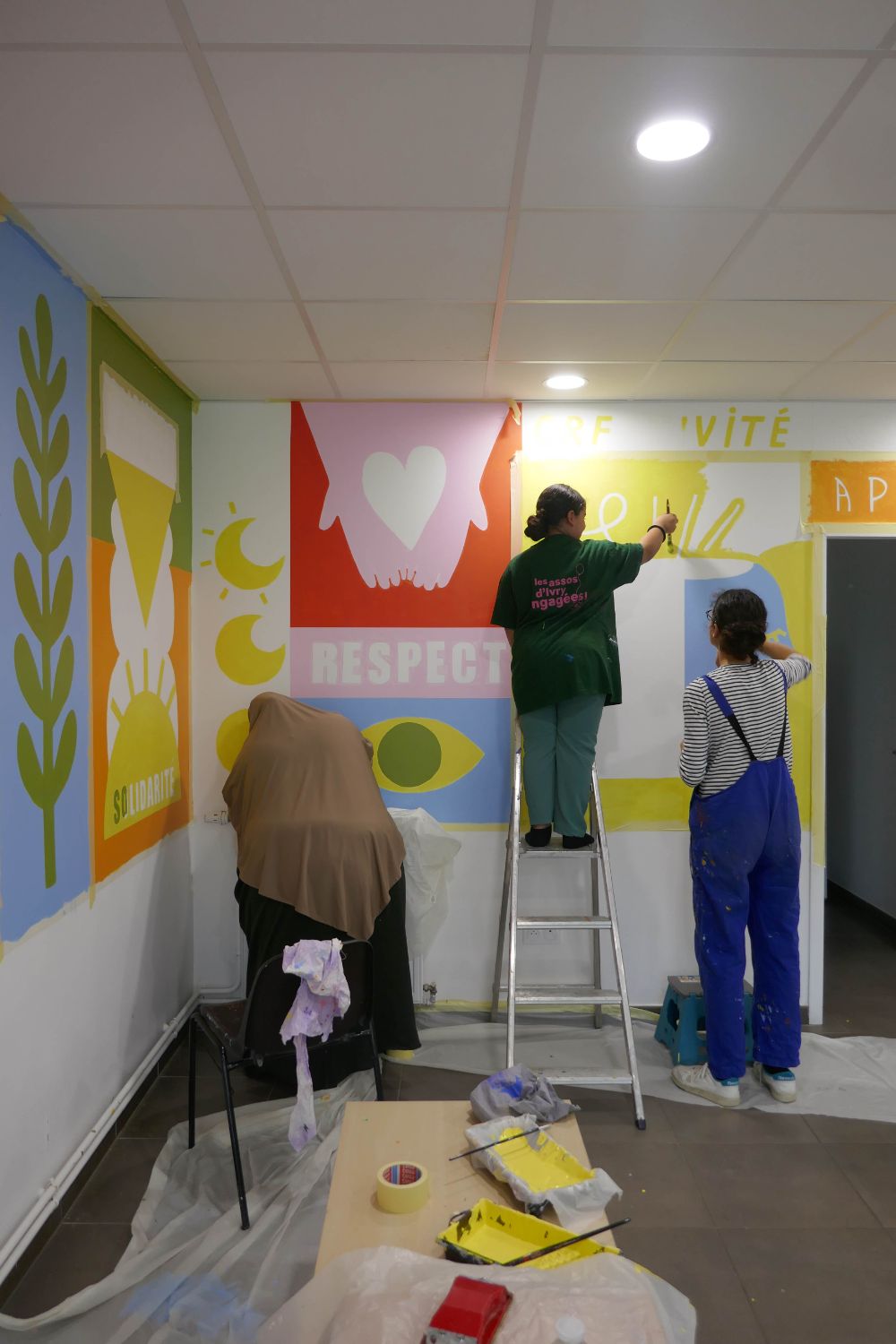 Dans le cadre de la réalisation d’une peinture murale en coopération avec les résident·es dans la salle polyvalente de la résidence Jean Rostand et à la suite de la conception d’un livret de présentation du projet de vie sociale et partagée de la résidence, notre collectif est intervenu pour définir avec les résident·es les valeurs de la maison des projets et les mettre en image.