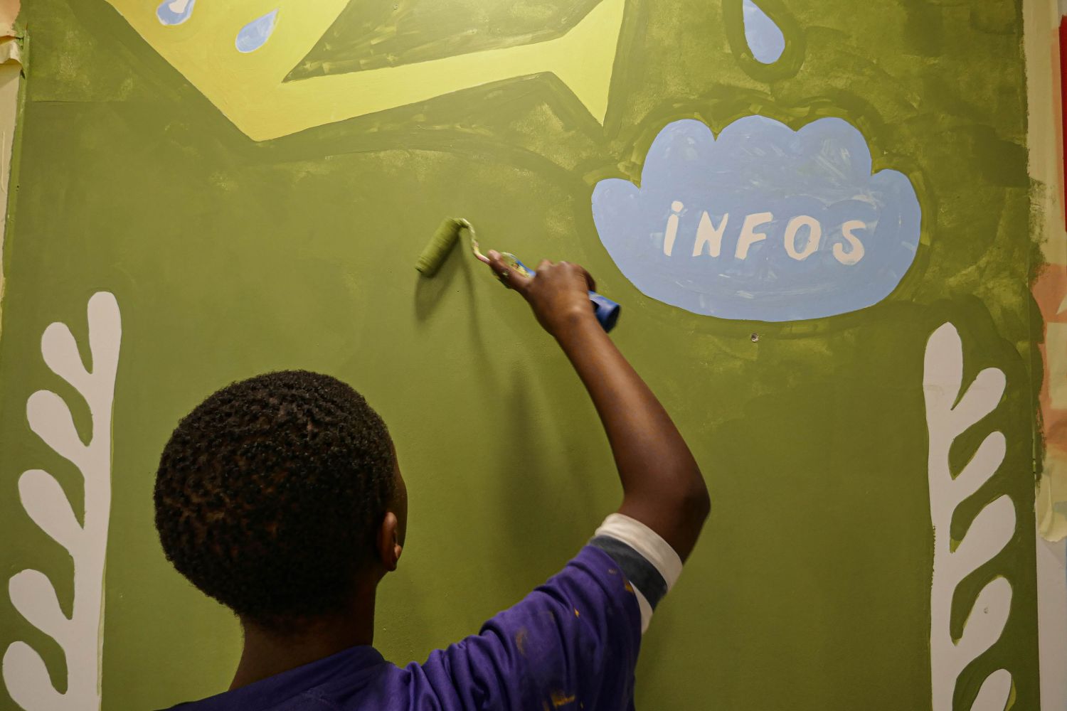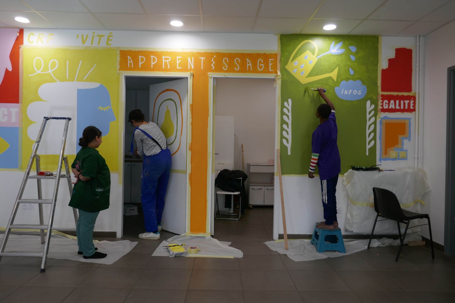 Dans le cadre de la réalisation d’une peinture murale en coopération avec les résident·es dans la salle polyvalente de la résidence Jean Rostand et à la suite de la conception d’un livret de présentation du projet de vie sociale et partagée de la résidence, notre collectif est intervenu pour définir avec les résident·es les valeurs de la maison des projets et les mettre en image.