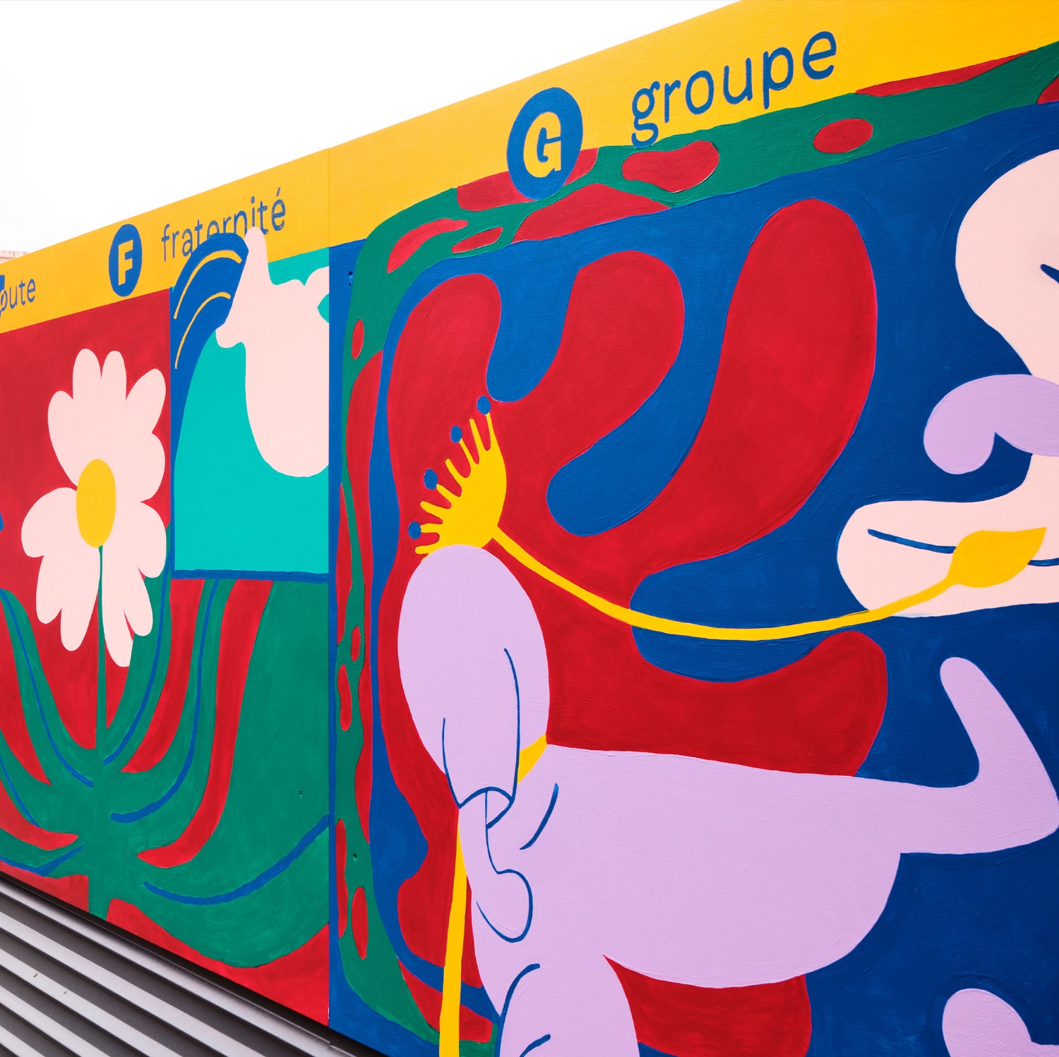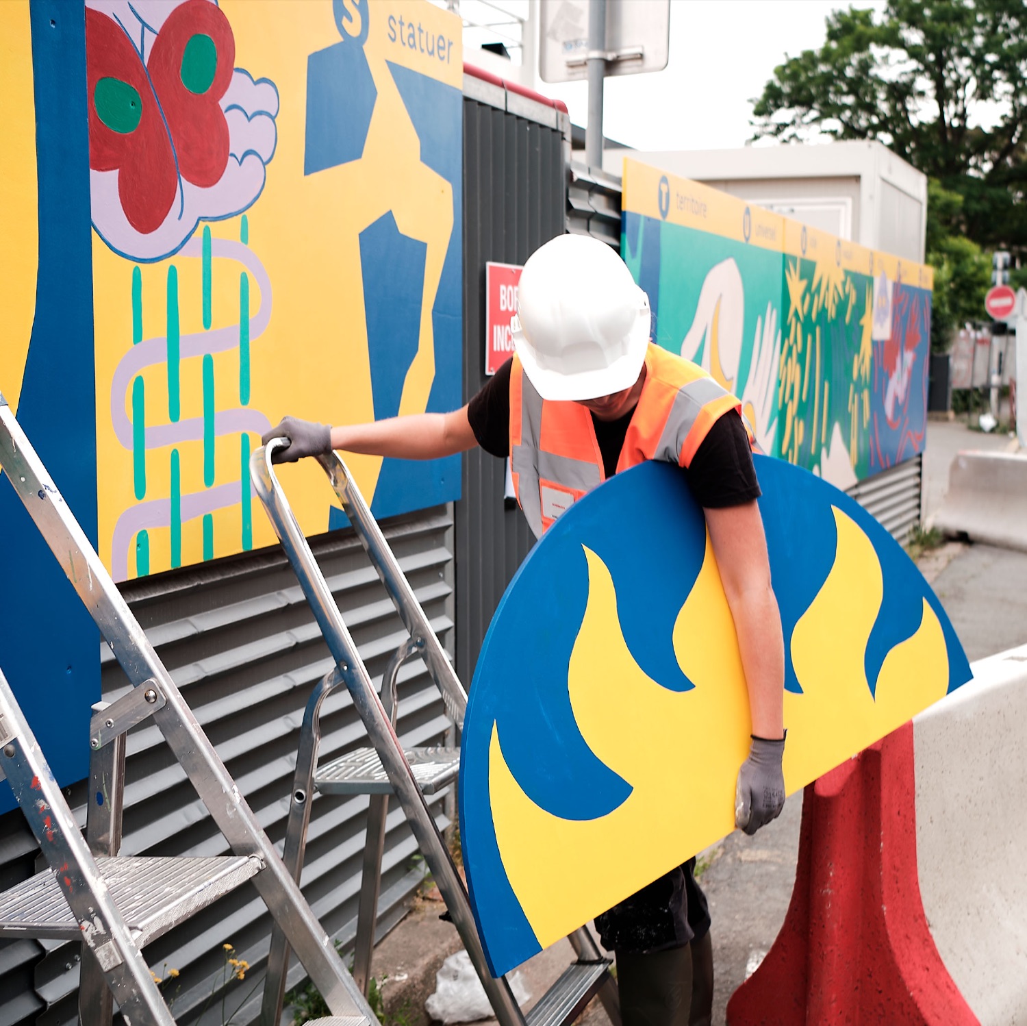 Conception et réalisation d’une fresque murale sur une palissade de chantier.