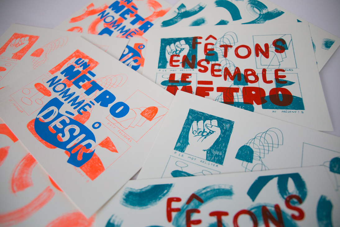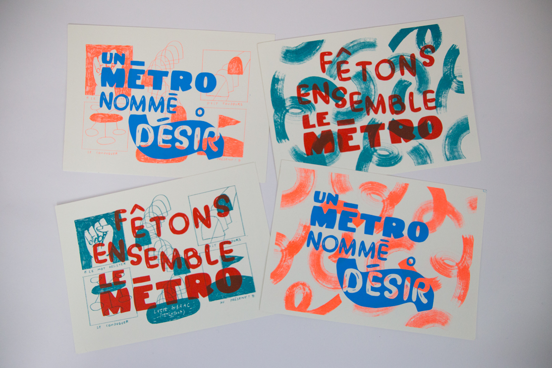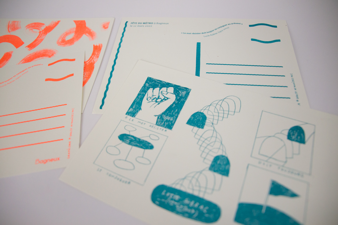 Nous sommes venus sur 3 événements : à Nanterre pour la “Fête de la vie associative”, pour “Ivry en fête” à Ivry-sur-Seine et “La fête du métro” à Bagneux, où nous avons déambulé avec notre dispositif des ouvreuses pour pouvoir imprimer des visuels en sérigraphie et les distribuer aux personnes participants aux événements.