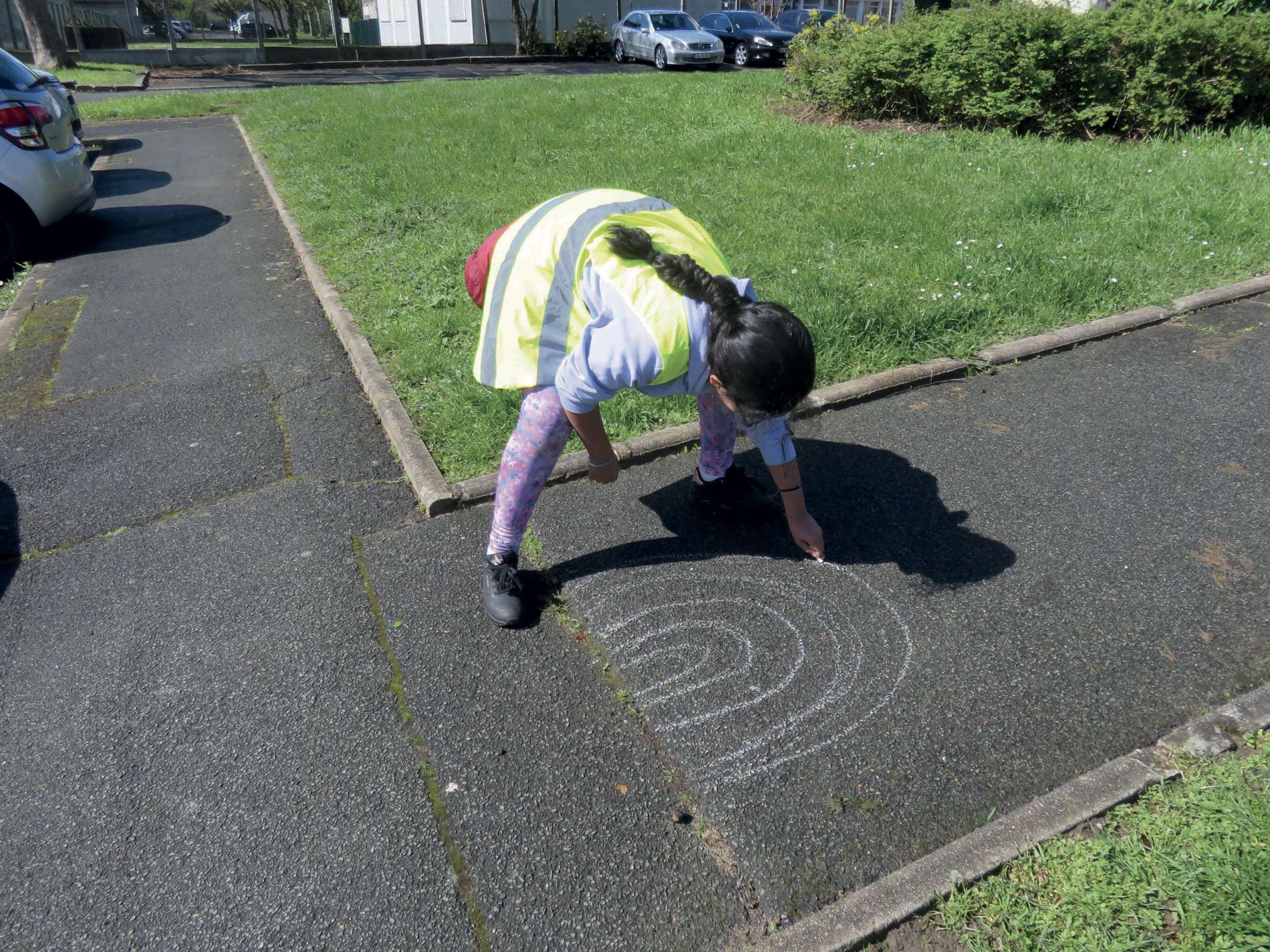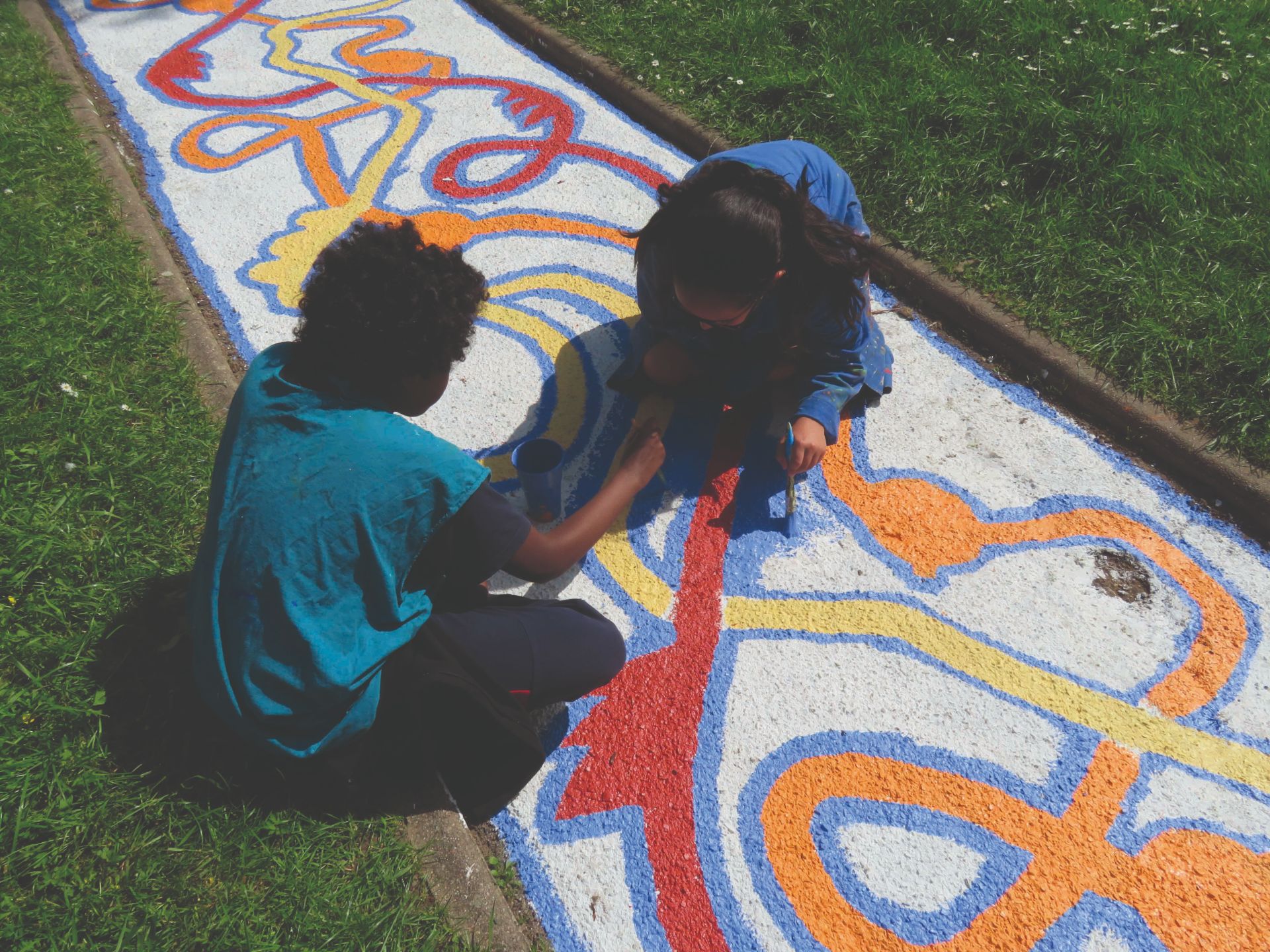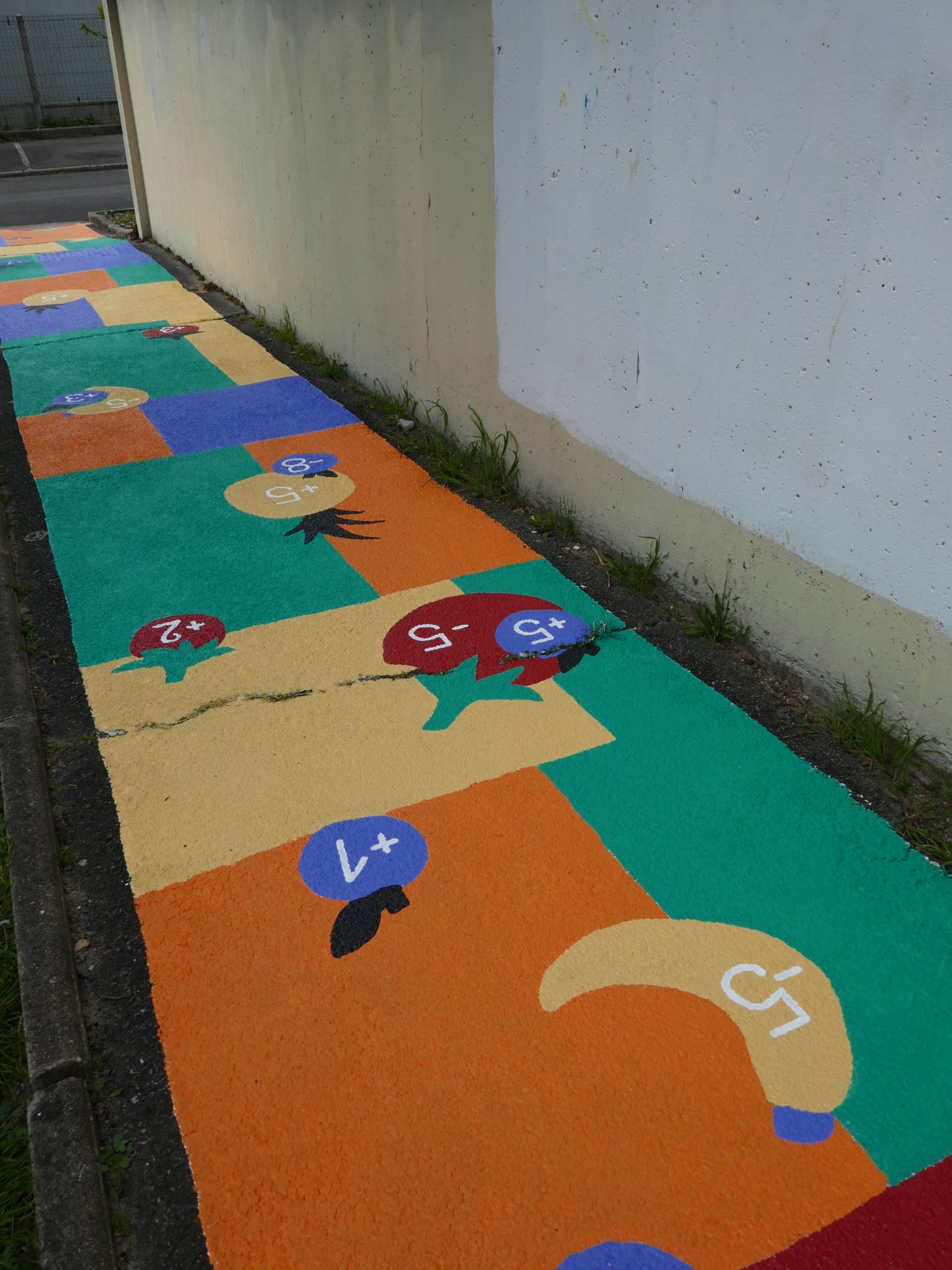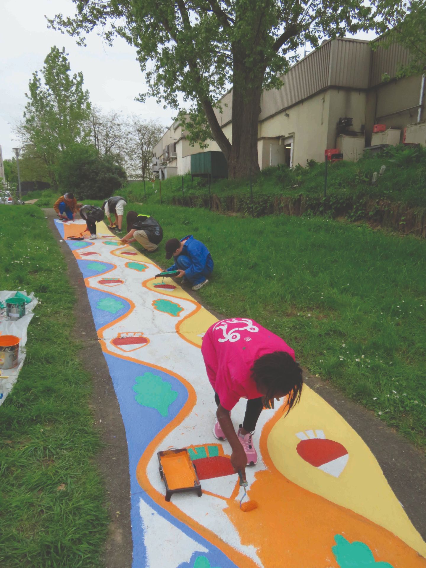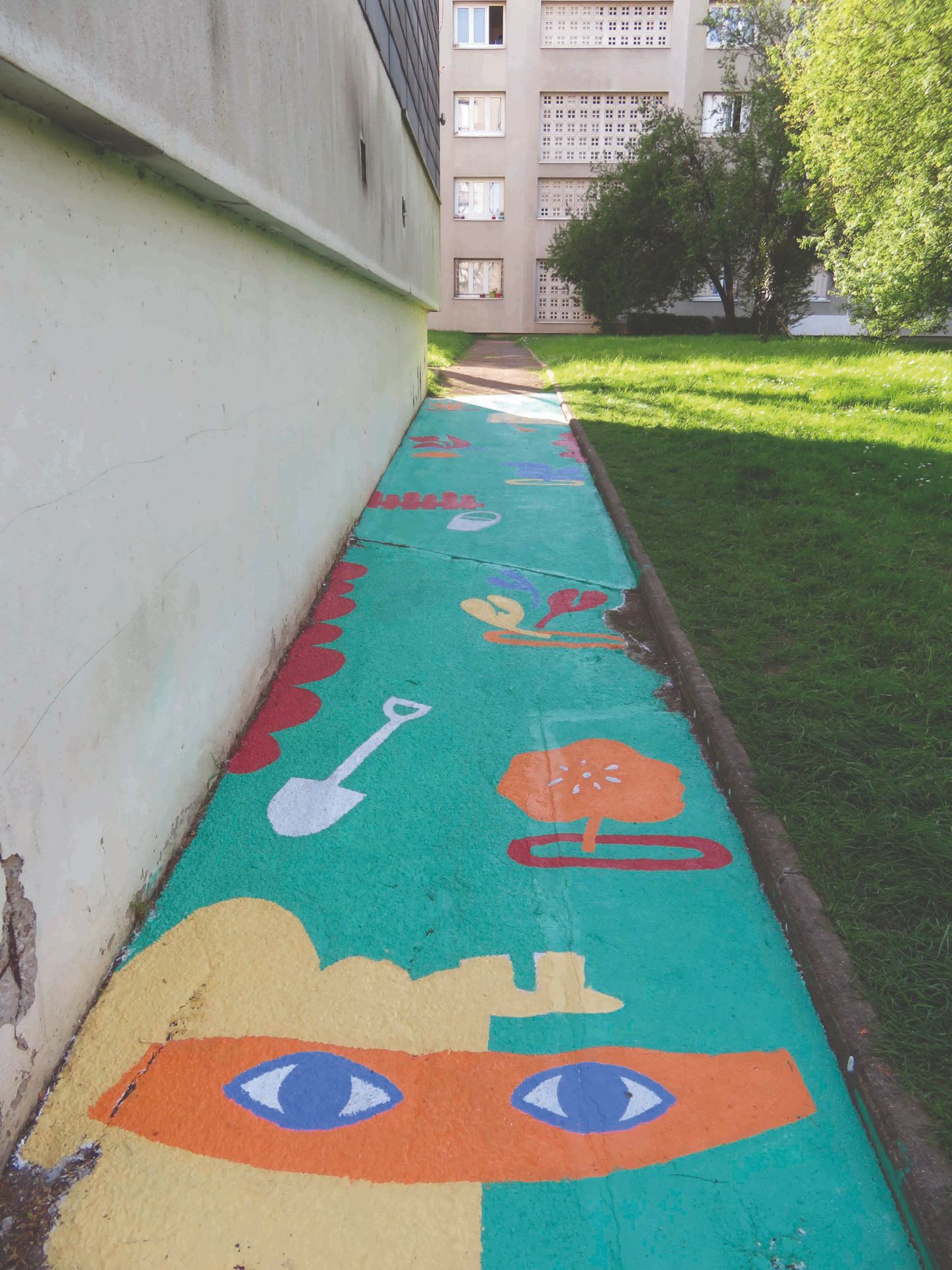 ☞ Nous sommes revenu·es cette année encore à Villeneuve-Saint-Georges pour réaliser avec les enfants des fresques sur le sol dans la côté Thimonnier. Sur plusieurs jours, nous avons peint les jeux conçus par les enfants autour de la pépinière, environ 80 mètres de chemin peints en collaboration avec les enfants du centre Saint-Exupéry