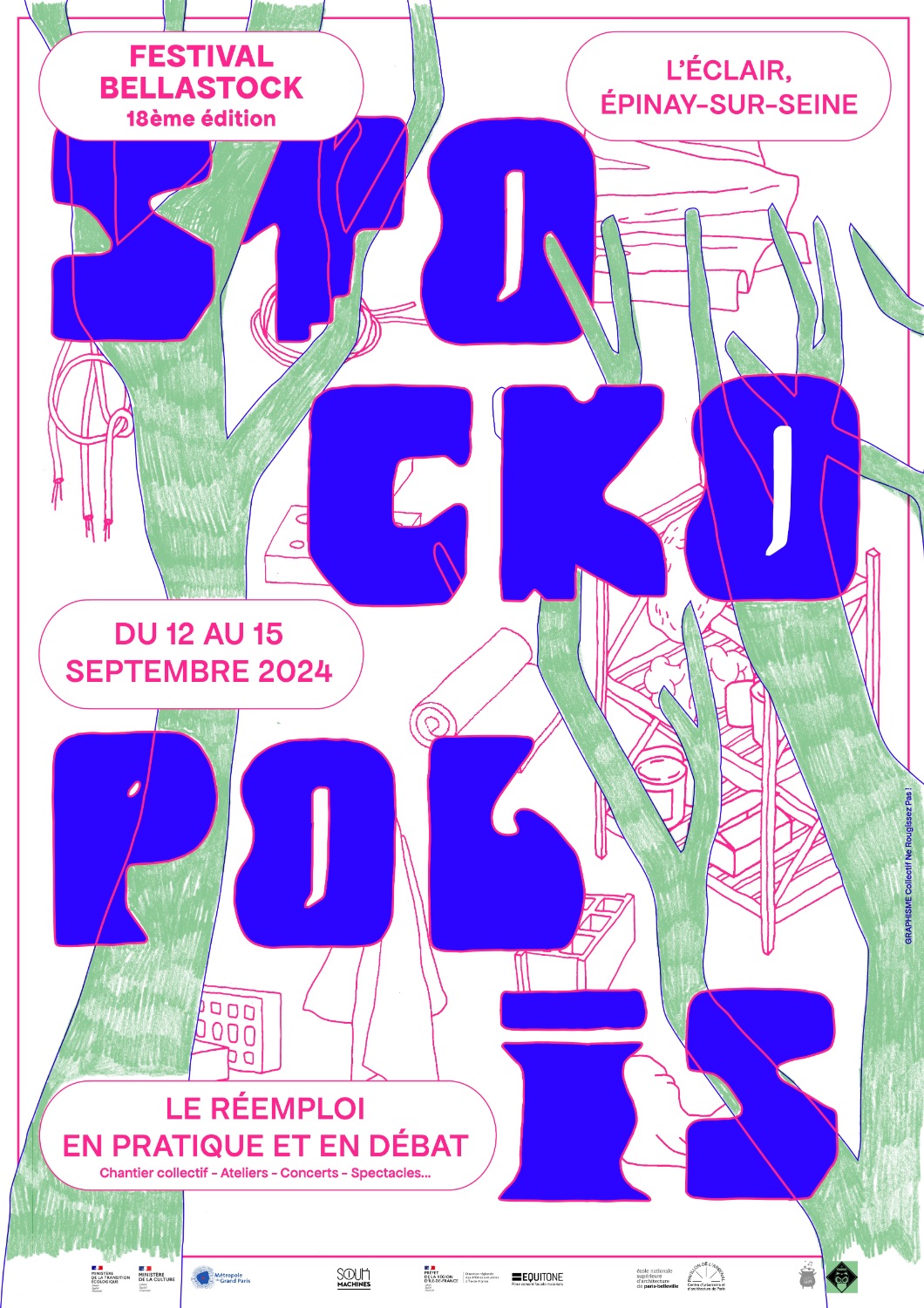 Pour la 18ème édition de son festival, le collectif Bellastock a fait appel à Ne Rougissez Pas! pour réaliser l’affiche de l'événement. Le festival appelé Stockopolis cette année, propose aux participants de concevoir, construire et habiter une ville éphémère à l’échelle 1:1.