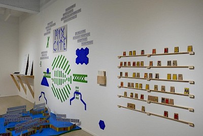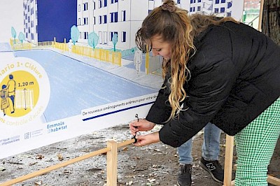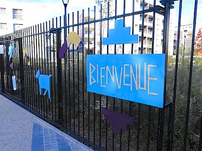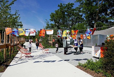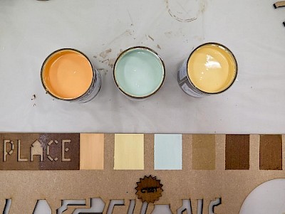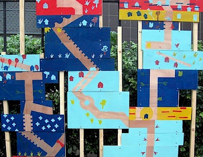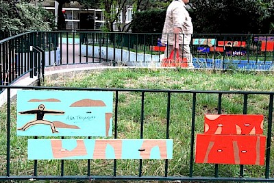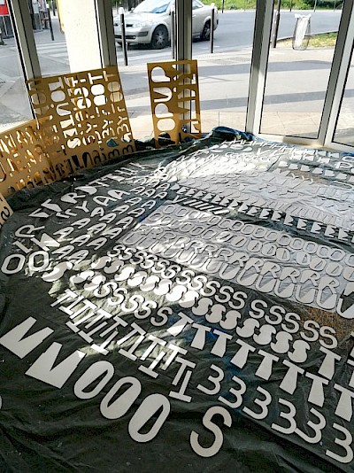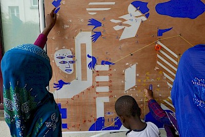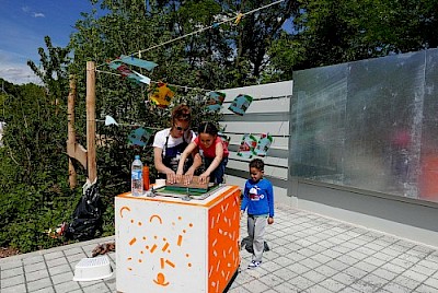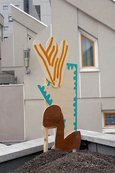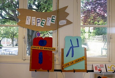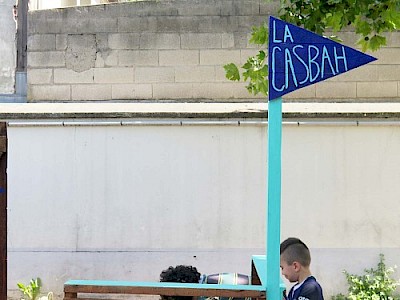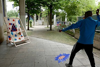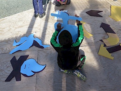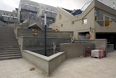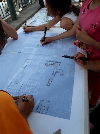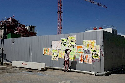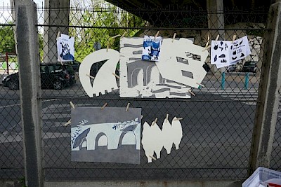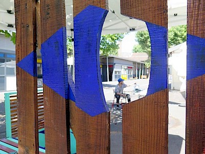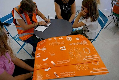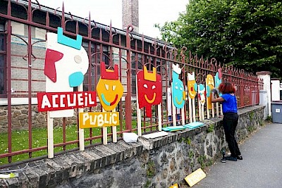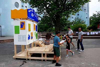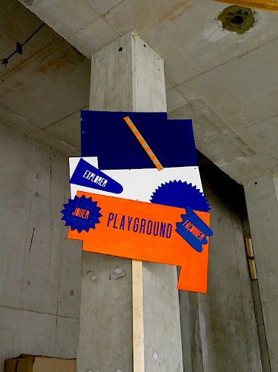 Espace pour signaler et intriguer. Création et réalisation d'une signalétique au sein de la plateforme conçue par les architectes YA+K. Mise en place d'ateliers participatifs pour la création d'une signalétique collaborative sur la place avec les enfants de la Maison de Quartier Roser. Projet porté par La Maison de Quartier Roser Intervention…