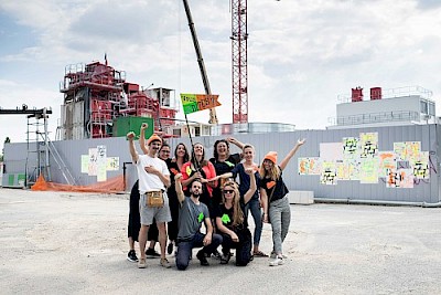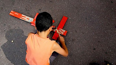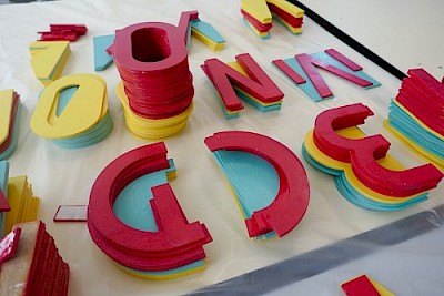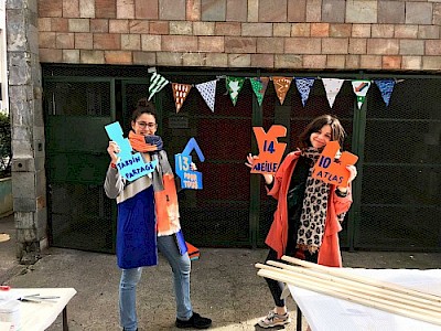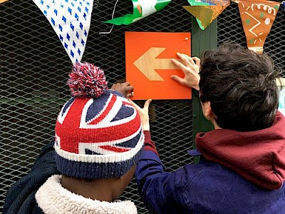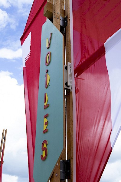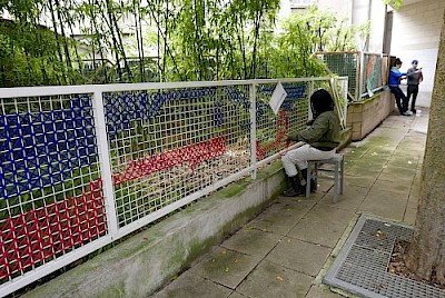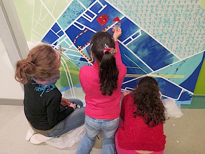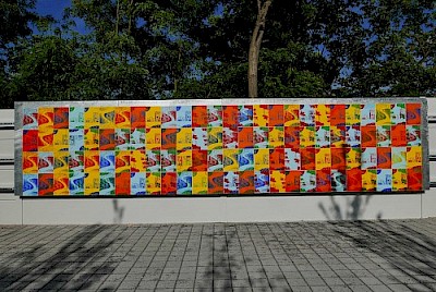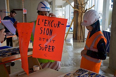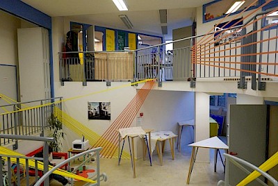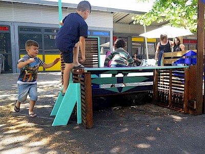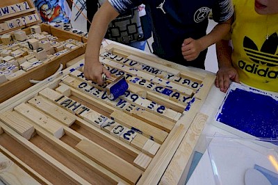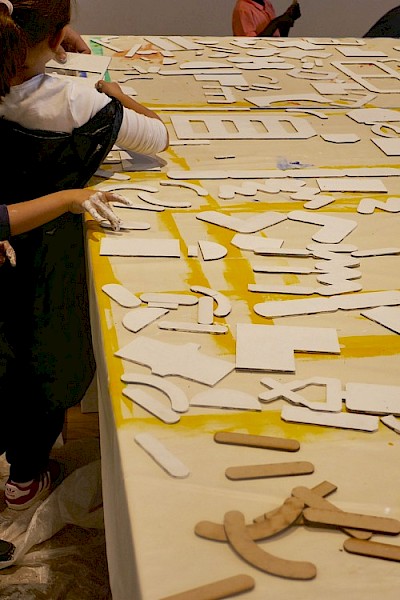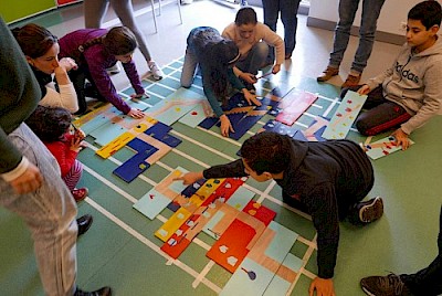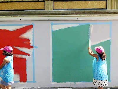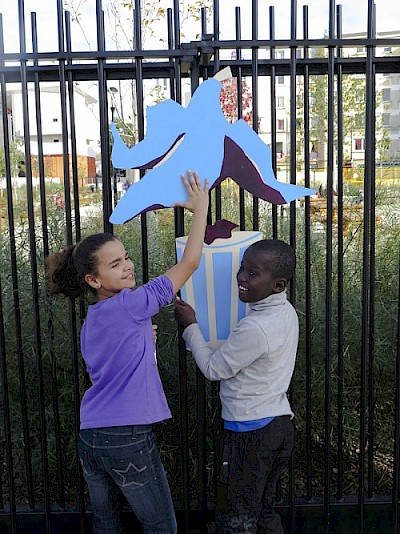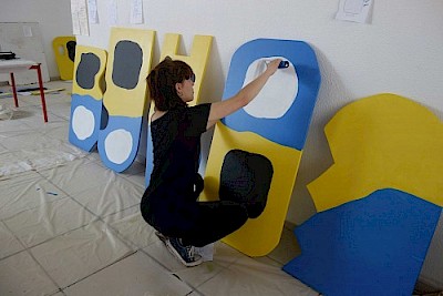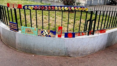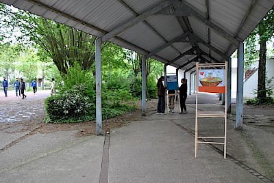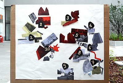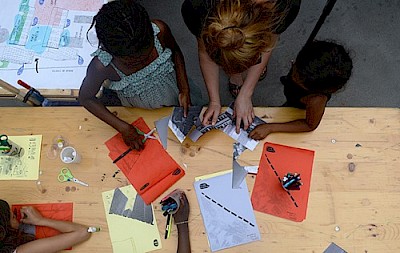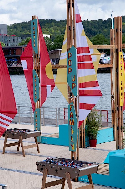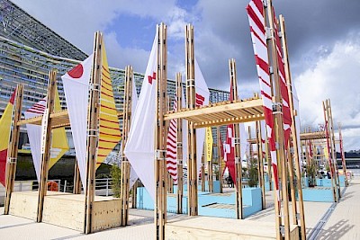 Espace pour signaler et intriguer. Création et réalisation d'une signalétique au sein de la plateforme conçue par les architectes YA+K. Mise en place d'ateliers participatifs pour la création d'une signalétique collaborative sur la place avec les enfants de la Maison de Quartier Roser. Projet porté par La Maison de Quartier Roser Intervention…