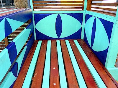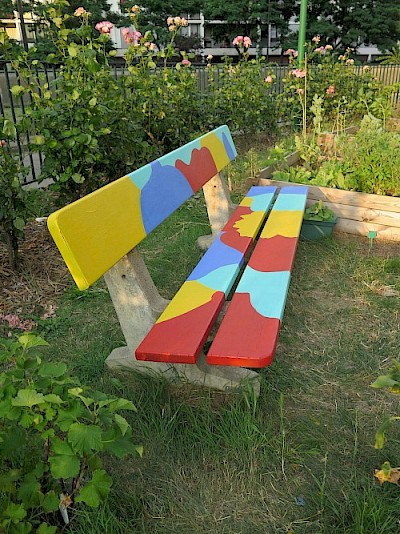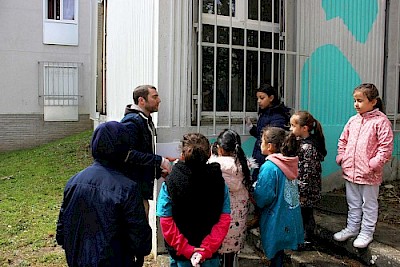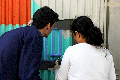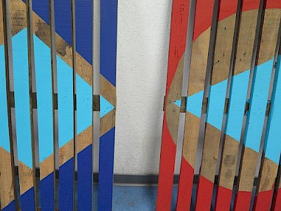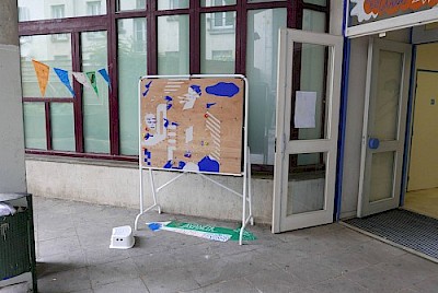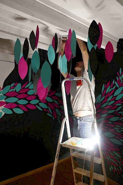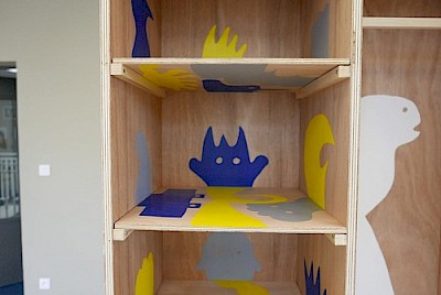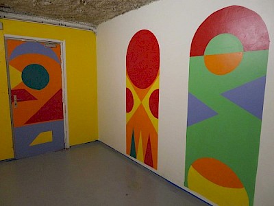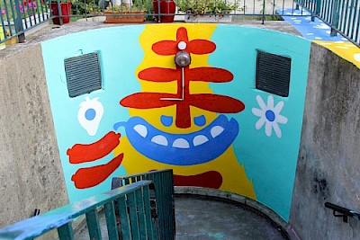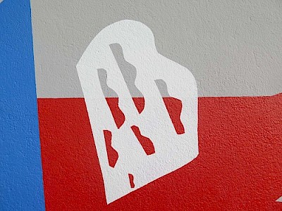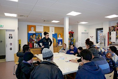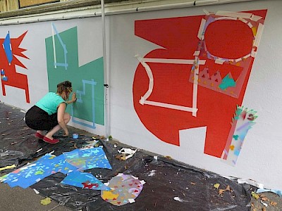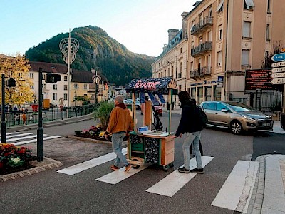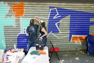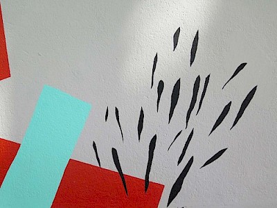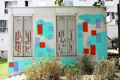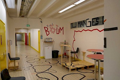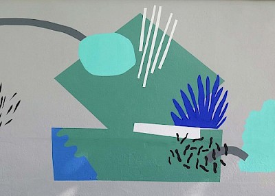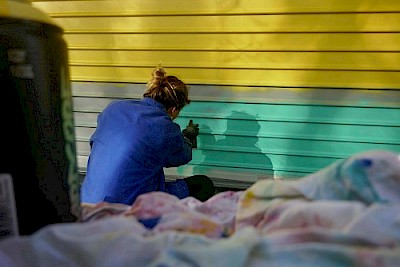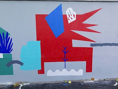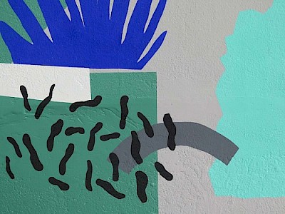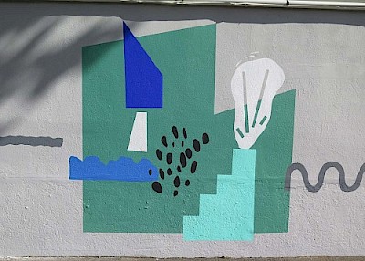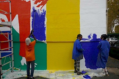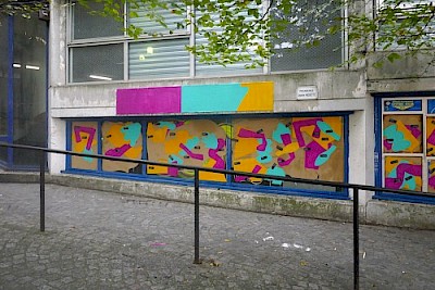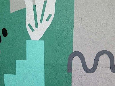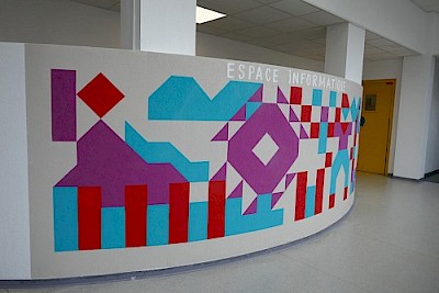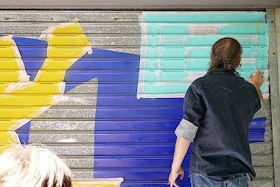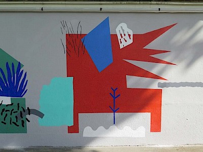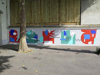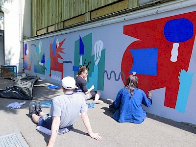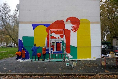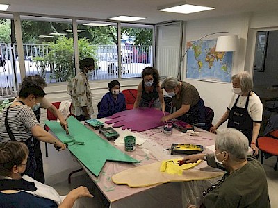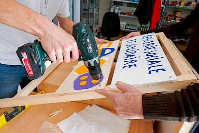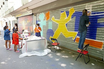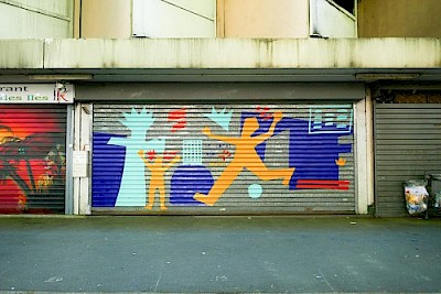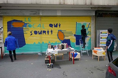 Après un premier travail d’aménagement réalisé en 2019 pour le “Local qui sourit”, notre collectif a mené des ateliers de création avec les usagers et usagères du lieu pour penser la future fresque du rideau de fer. A la suite de ces temps de conception collectifs, nous avons réalisé en ateliers participatifs la fresque qui habille désormais…