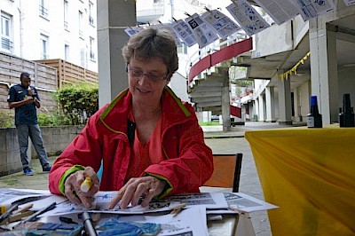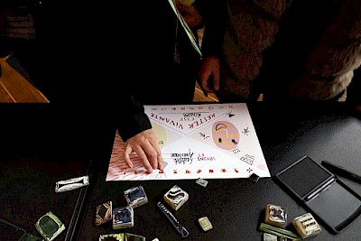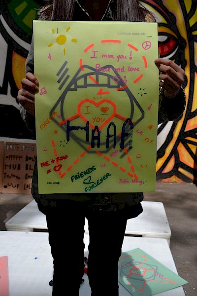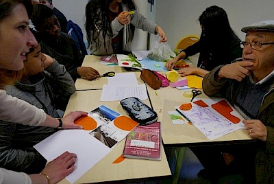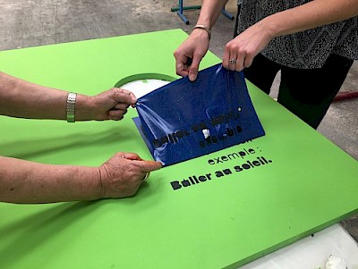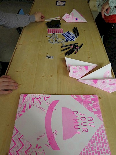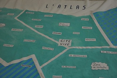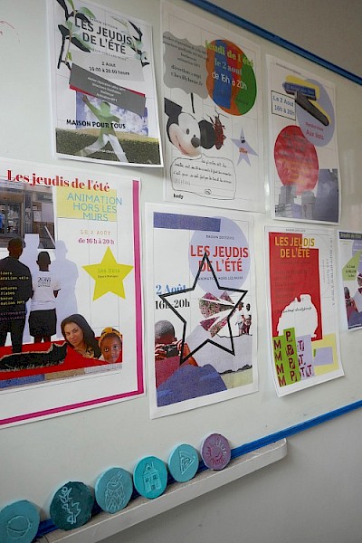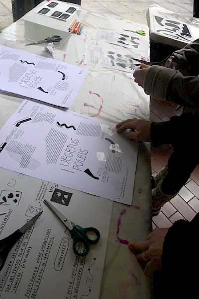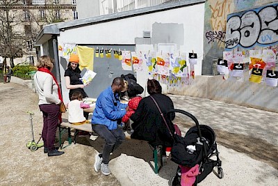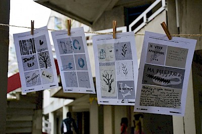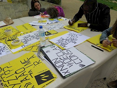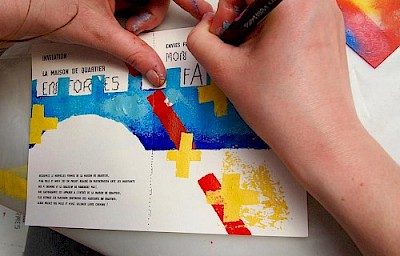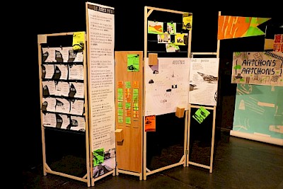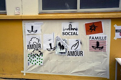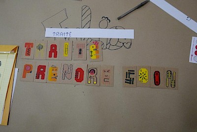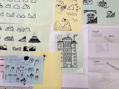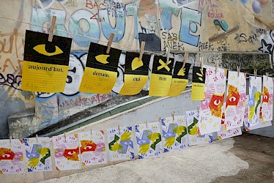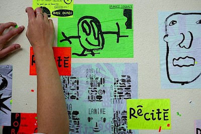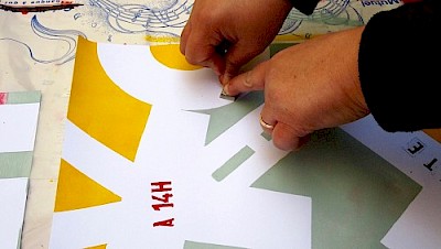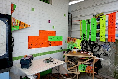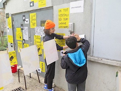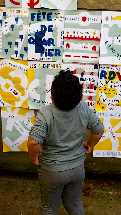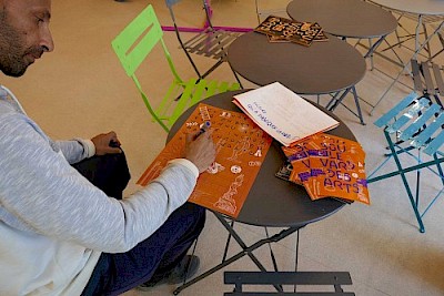 Atelier d'affiches volantes Nous avons proposé un atelier d’affiches où sont mêlées recherche textuelle et création graphique. Autour de la revendication individuelle et collective de la vie du quartier, les participants ont été amenés à débattre et échanger. Ils ont complété ensuite des phrases insolentes et vivantes pour traduire leur envies…
