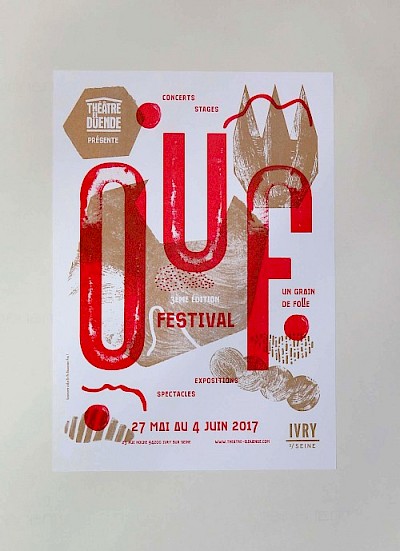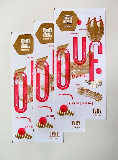 Trois éditions du Ouf festival Conception de la communication de l’événement et réalisation de différents supports de communications. Année 2017 Communication papier: Trois modèles d'affiches A3 en 200 exemplaires et un dépliant format fermé avec deux plis en 800 exemplaires faconnés à la main imprimés en risographie chez Après midi Lab Année 2015…