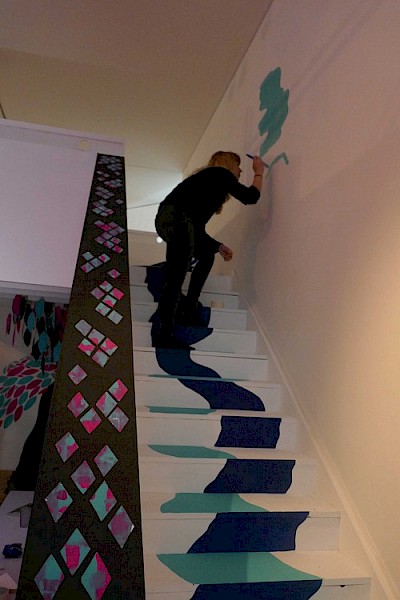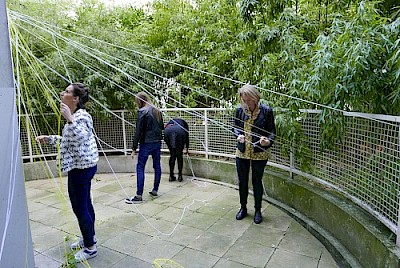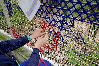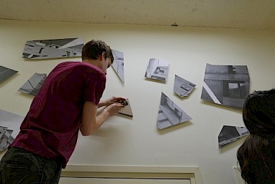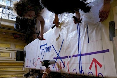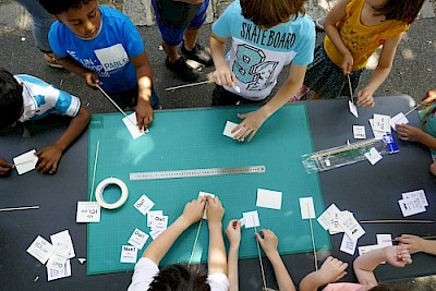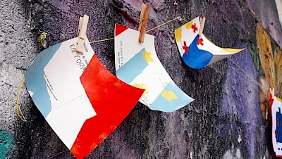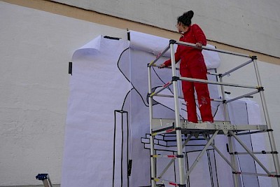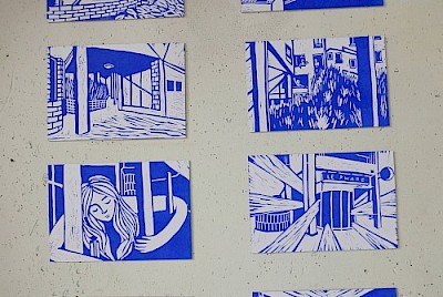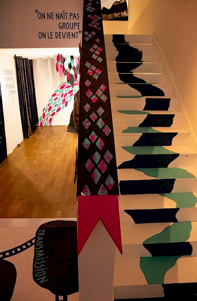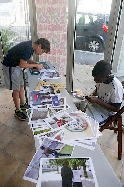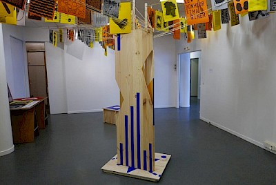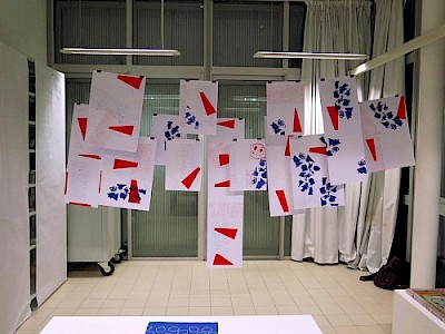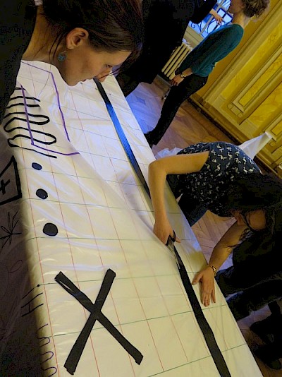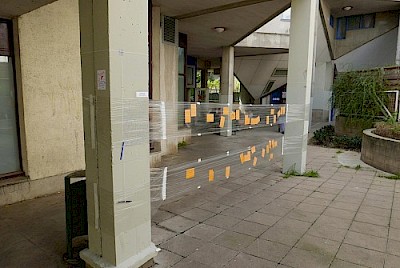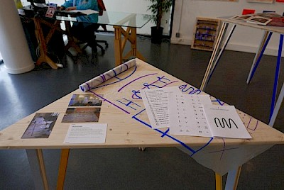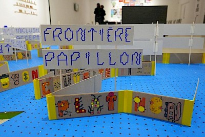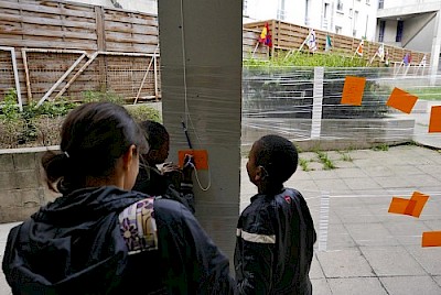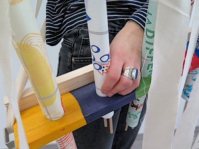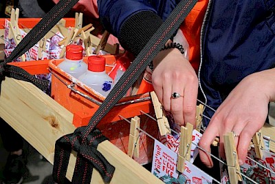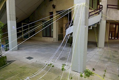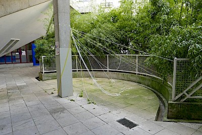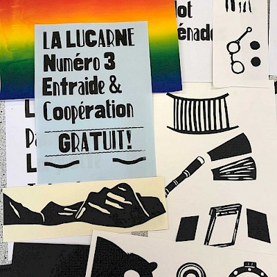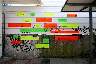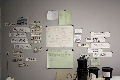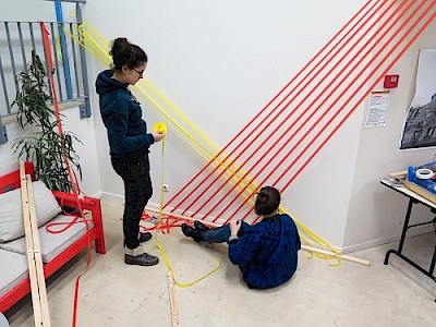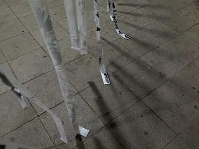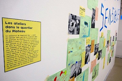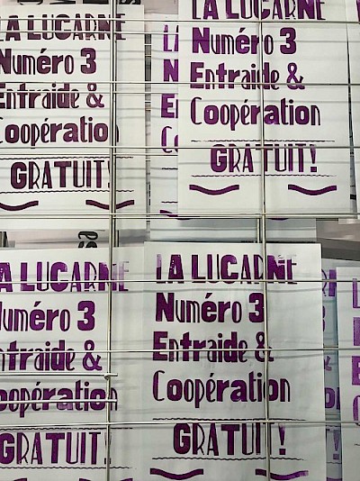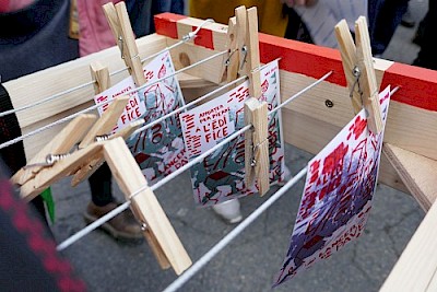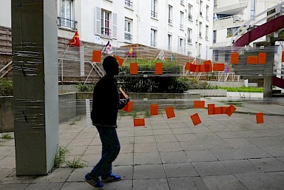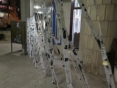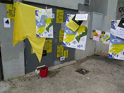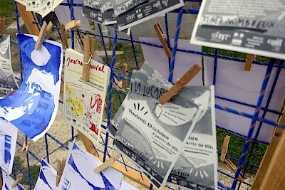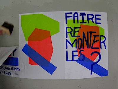 "Remonter les questions" est une installation accrochée dans l’espace situé devant le local utilisé par le collectif, afin de valoriser la parole des habitants. Au moyen de fils tendus en hauteur, des bandelettes de papier réalisées à l'imprimante thermique ont été suspendues les unes à côté des autres, comportant des interventions graphiques…