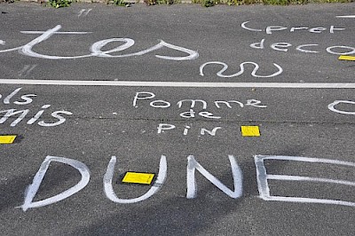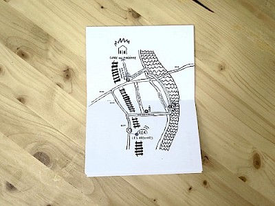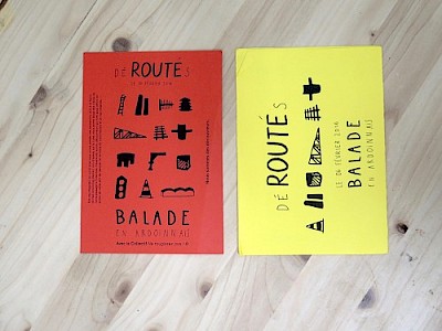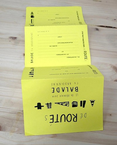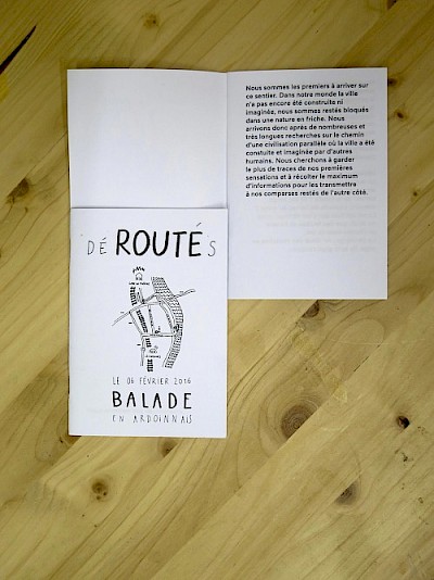 Organisée par Gare au Théâtre, nous avons guidé la balade en Ardoinais en proposant aux participants d'imaginer une fiction. Ceux-ci ont reçu un carnet de découvreurs, avec des exercices visuels proposés au fil du trajet. Nous avons ainsi au fur et à mesure réalisé des interventions graphiques dans l'espace. Nous sommes des découvreurs, déroutés…
