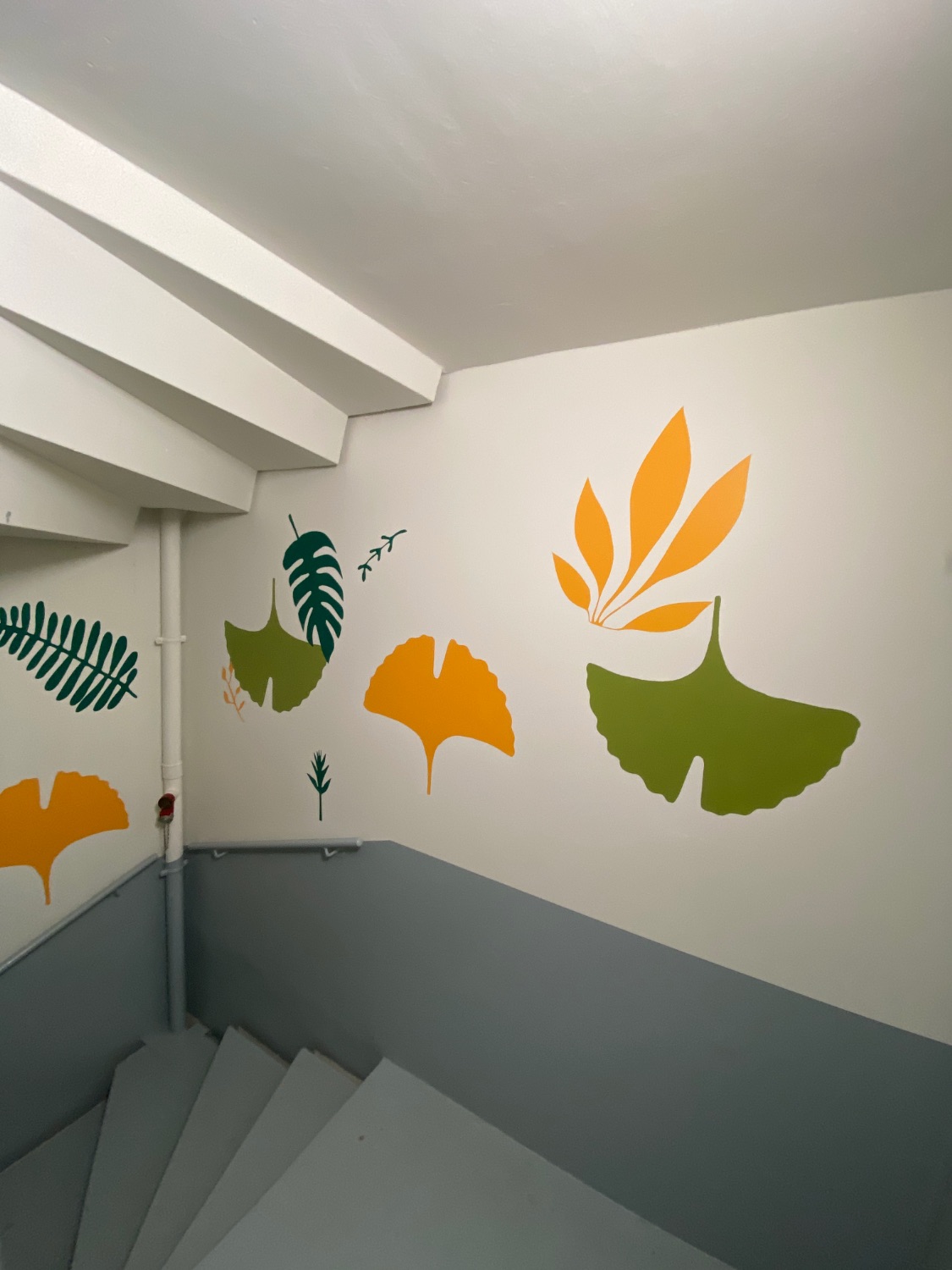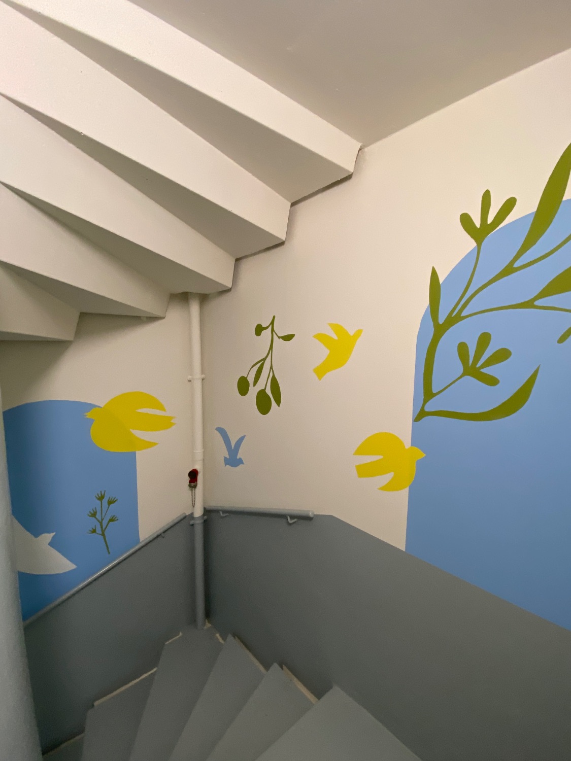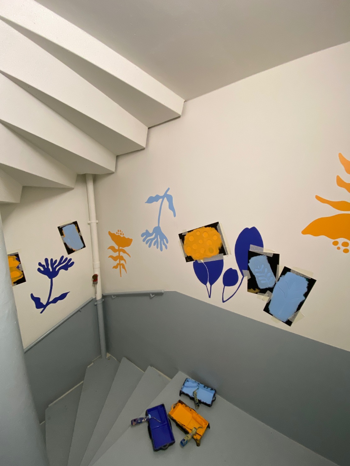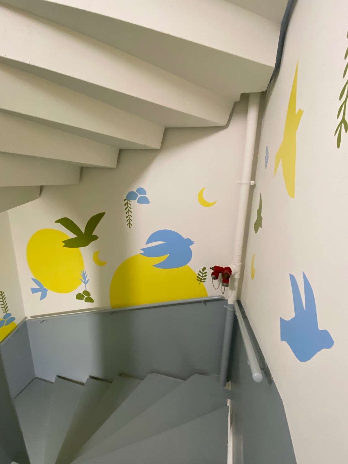 ☞ Dans le cadre de l’amélioration du cadre de vie de la résidence Albert Roussel, notre collectif est intervenu après un atelier de concertation auprès des résident·es pour réaliser une fresque dans la cage d’escalier de l’immeuble 6. Cette fresque est un voyage depuis les fonds marins jusqu'au ciel. Chaque univers prête une de ces couleurs au suivant, ce qui crée une évolution douce et dynamique des motifs, comme les habitant·es le souhaitaient pour cet espace de transition entre chez eux et le monde extérieur.