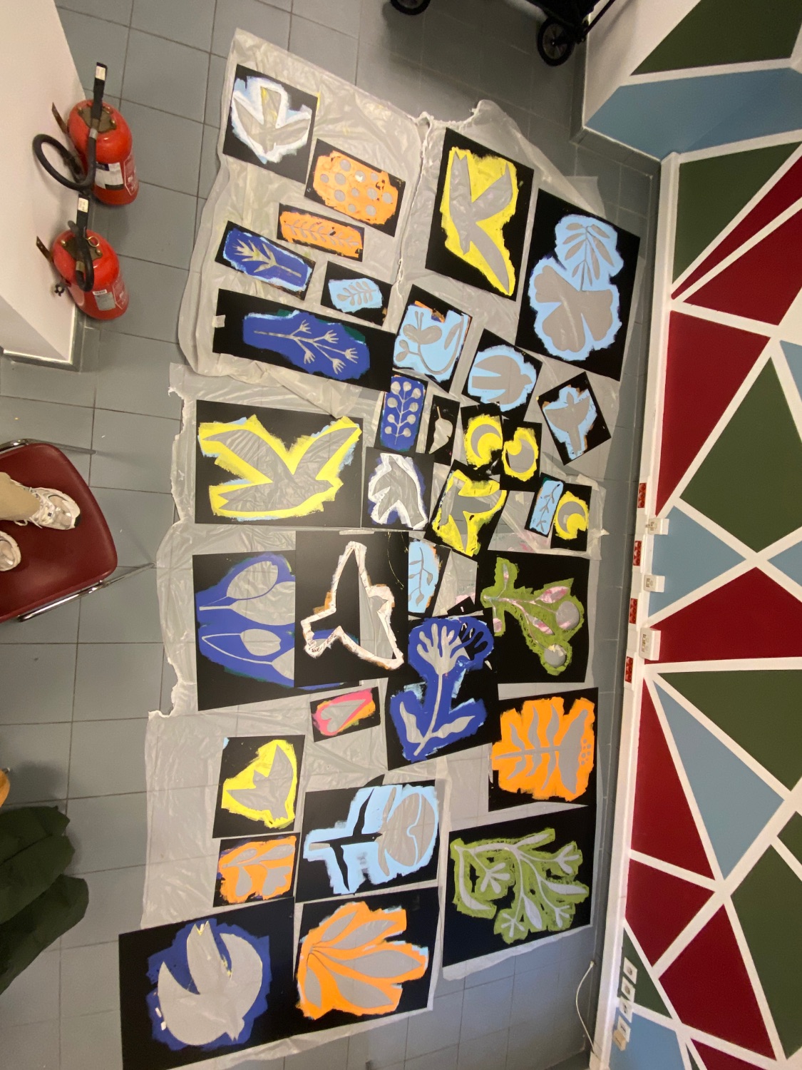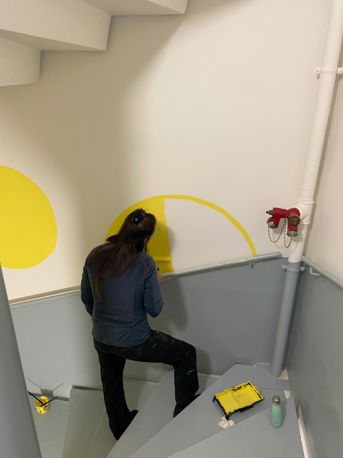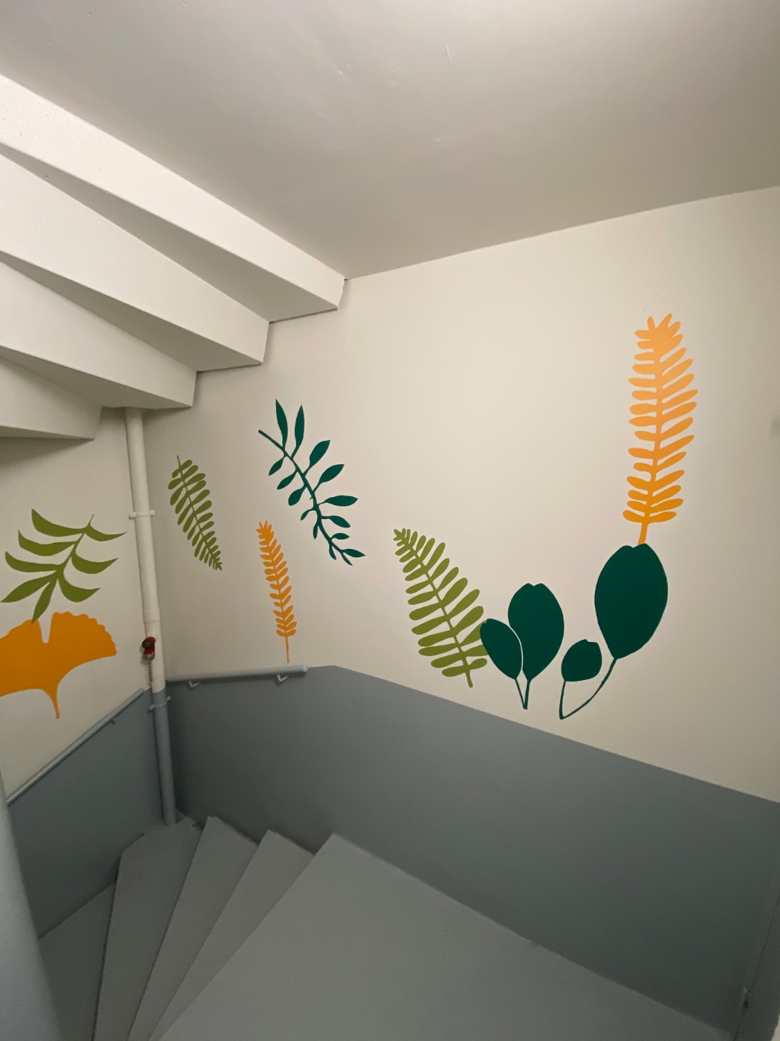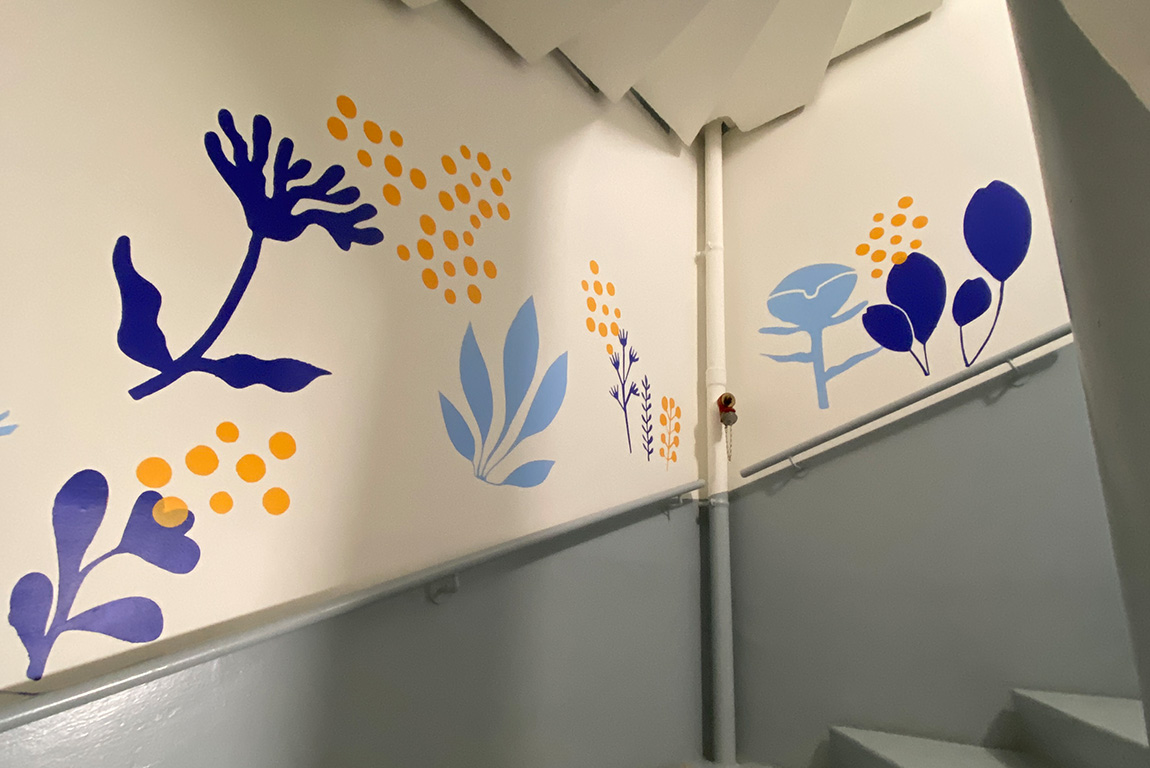 ☞ Dans le cadre de l’amélioration du cadre de vie de la résidence Albert Roussel, notre collectif est intervenu après un atelier de concertation auprès des résident·es pour réaliser une fresque dans la cage d’escalier de l’immeuble 6. Cette fresque est un voyage depuis les fonds marins jusqu'au ciel. Chaque univers prête une de ces couleurs au suivant, ce qui crée une évolution douce et dynamique des motifs, comme les habitant·es le souhaitaient pour cet espace de transition entre chez eux et le monde extérieur.