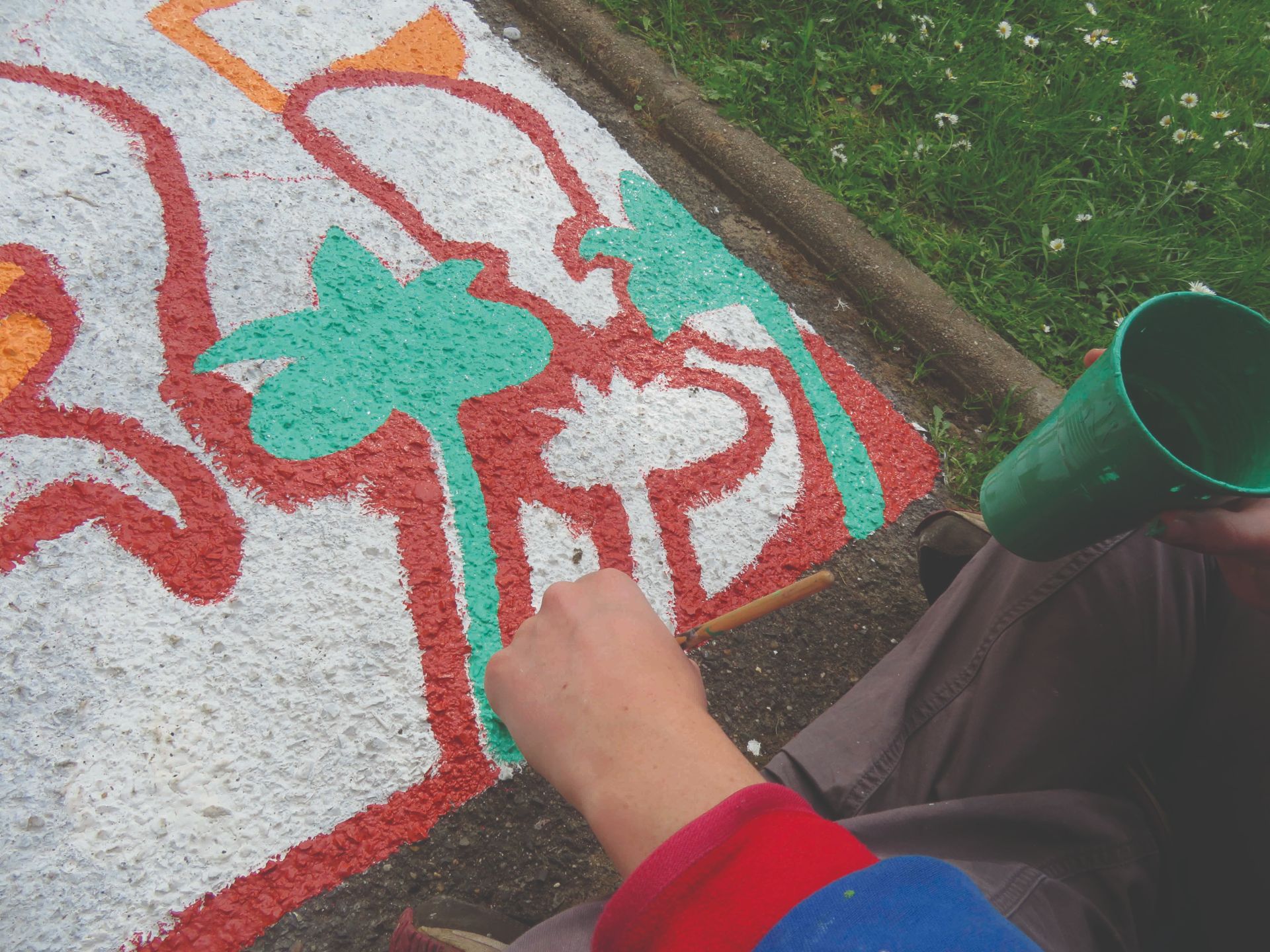 ☞ Nous sommes revenu·es cette année encore à Villeneuve-Saint-Georges pour réaliser avec les enfants des fresques sur le sol dans la côté Thimonnier. Sur plusieurs jours, nous avons peint les jeux conçus par les enfants autour de la pépinière, environ 80 mètres de chemin peints en collaboration avec les enfants du centre Saint-Exupéry