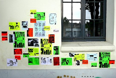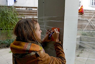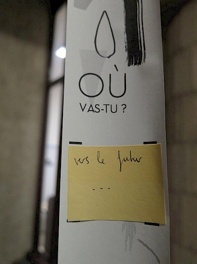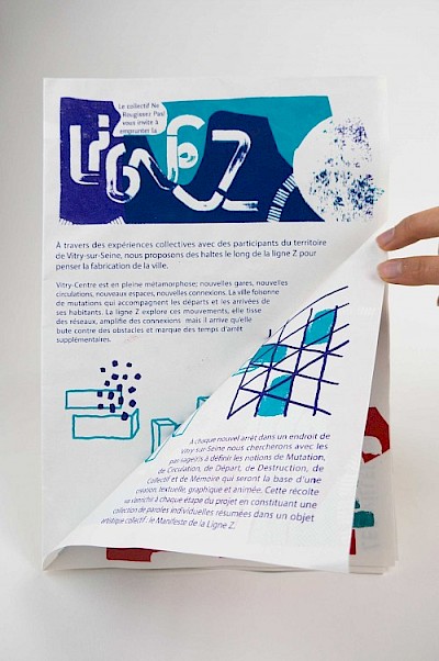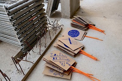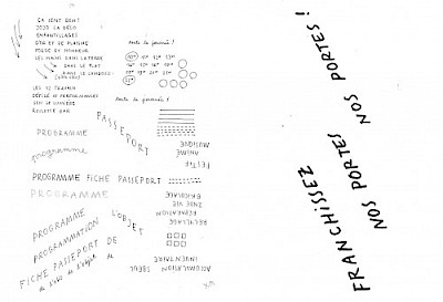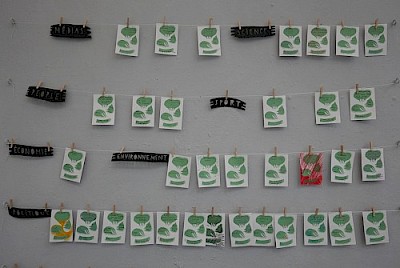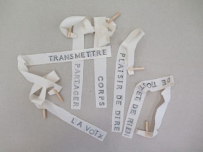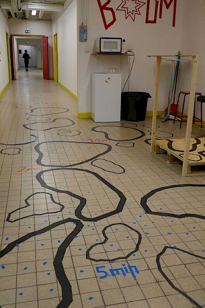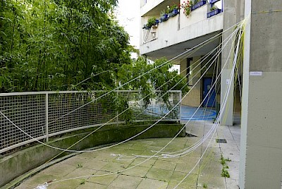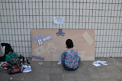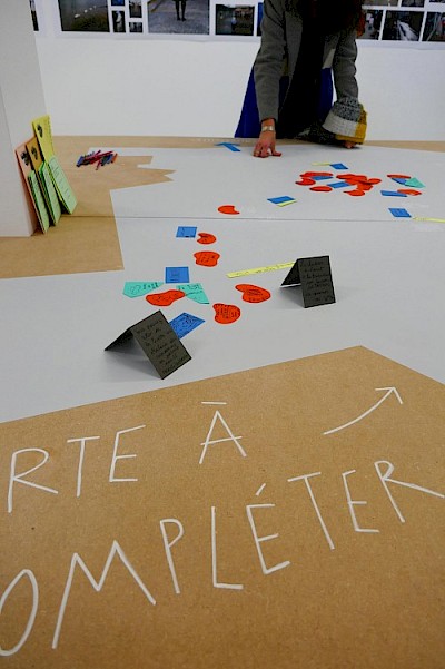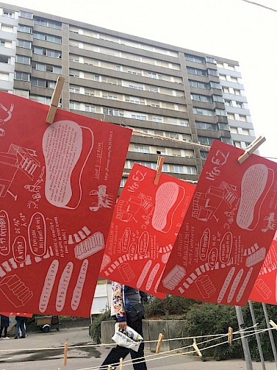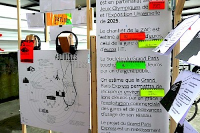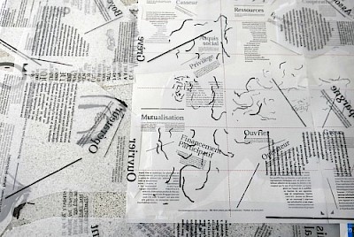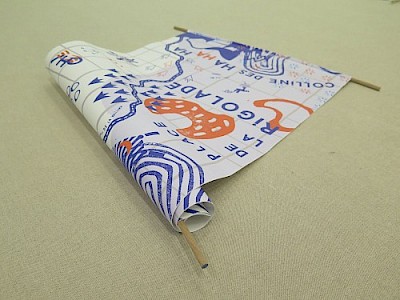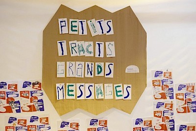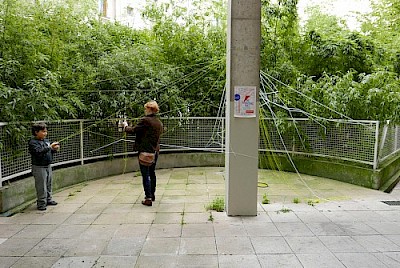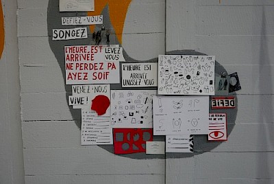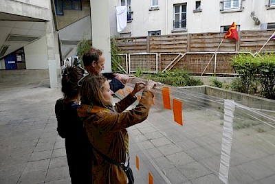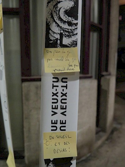 "Remonter les questions" est une installation accrochée dans l’espace situé devant le local utilisé par le collectif, afin de valoriser la parole des habitants. Au moyen de fils tendus en hauteur, des bandelettes de papier réalisées à l'imprimante thermique ont été suspendues les unes à côté des autres, comportant des interventions graphiques…