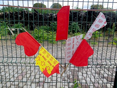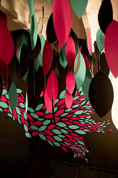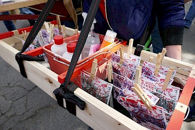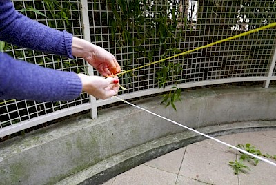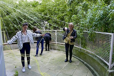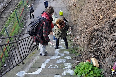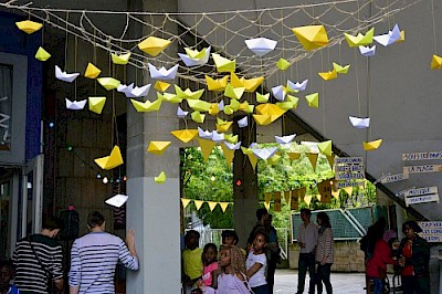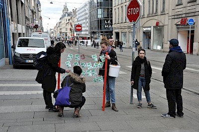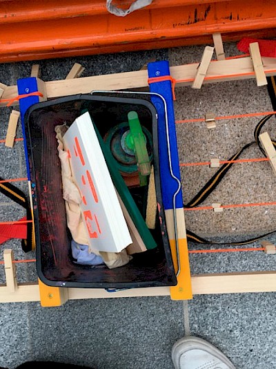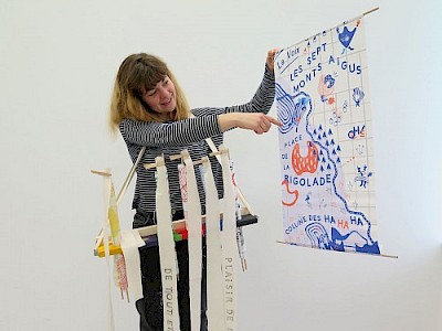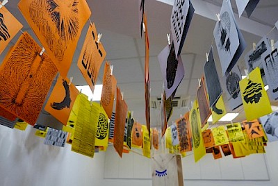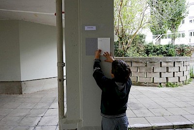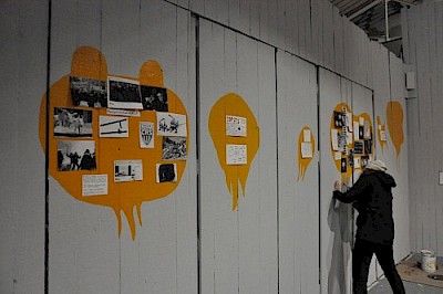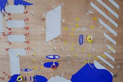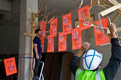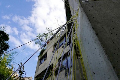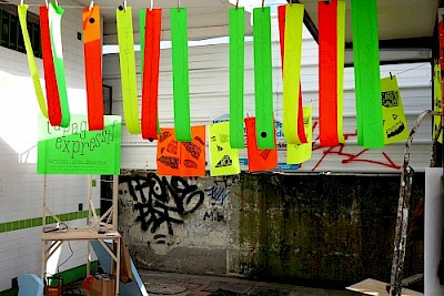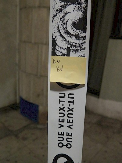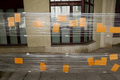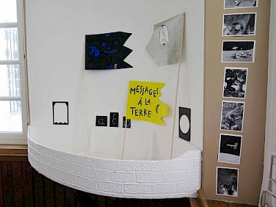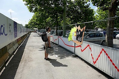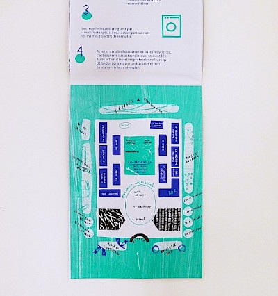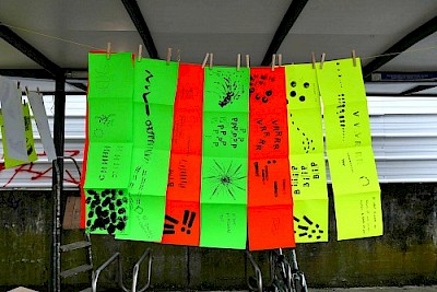 "Remonter les questions" est une installation accrochée dans l’espace situé devant le local utilisé par le collectif, afin de valoriser la parole des habitants. Au moyen de fils tendus en hauteur, des bandelettes de papier réalisées à l'imprimante thermique ont été suspendues les unes à côté des autres, comportant des interventions graphiques…