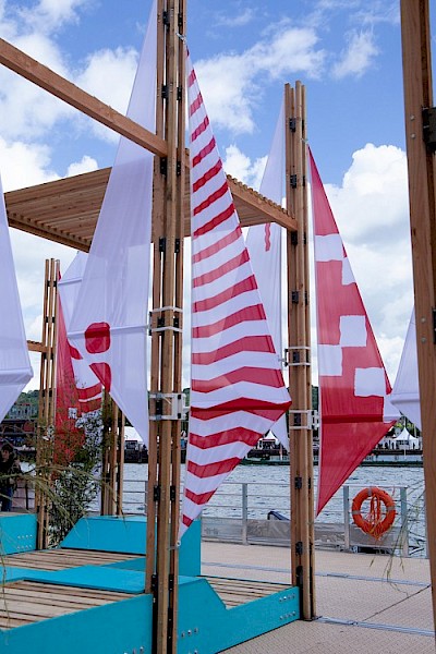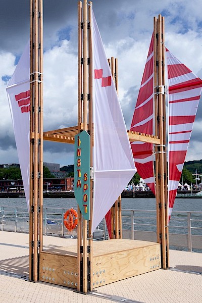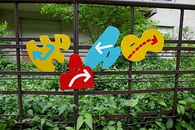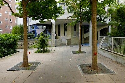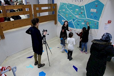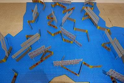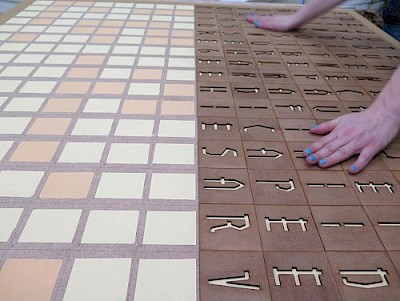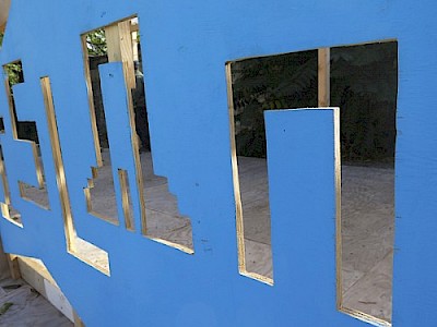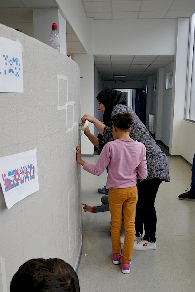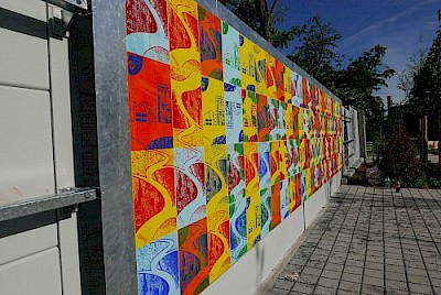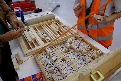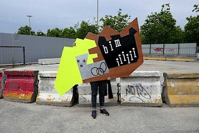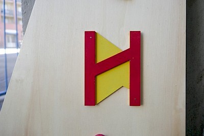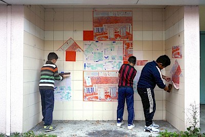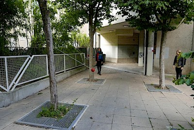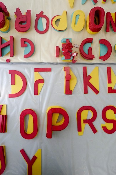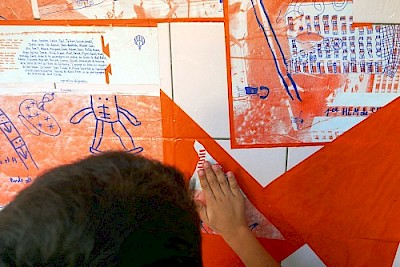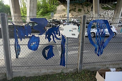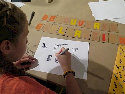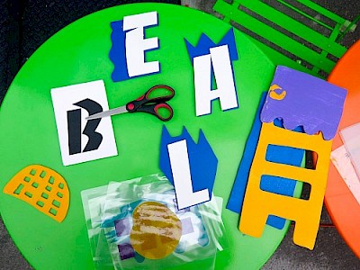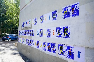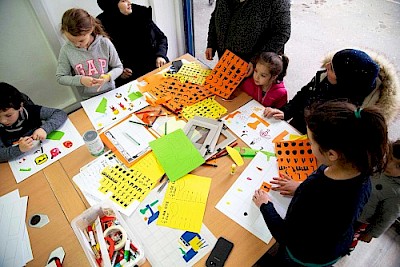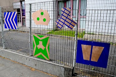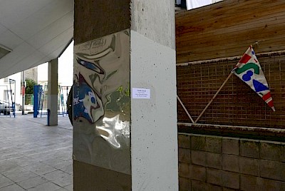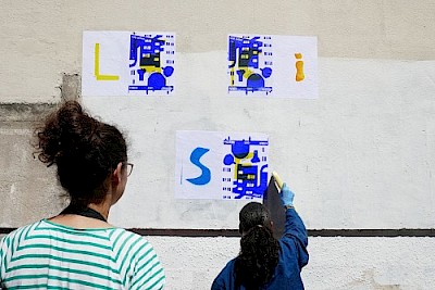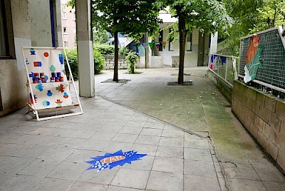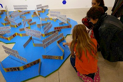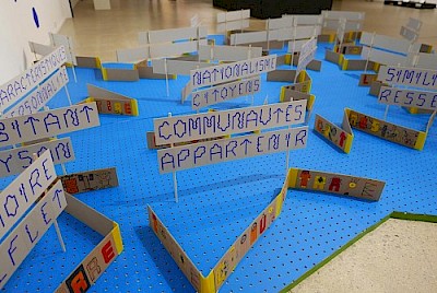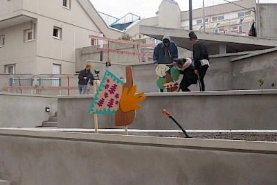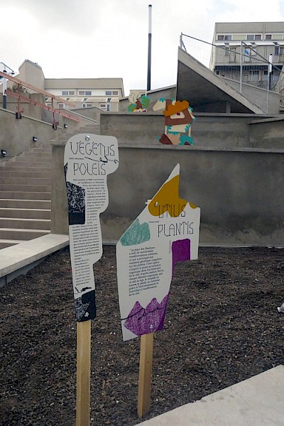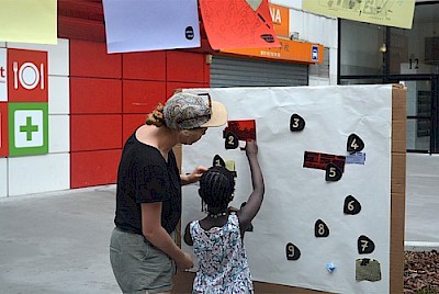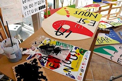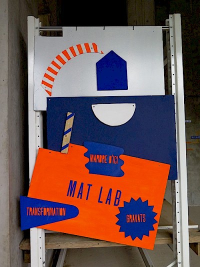 Espace pour signaler et intriguer. Création et réalisation d'une signalétique au sein de la plateforme conçue par les architectes YA+K. Mise en place d'ateliers participatifs pour la création d'une signalétique collaborative sur la place avec les enfants de la Maison de Quartier Roser. Projet porté par La Maison de Quartier Roser Intervention…