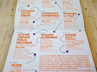 Projet d'identité graphique du cycle de conférences sur l’Art & l’Espace Public Création d’un univers graphique faisant référence au territoire, à la circulation dans la ville. Réalisation de supports de communication papier et numérique Commanditaire par l’association Object Public et coordonné par le Master PCEP de la Sorbonne Impression off…