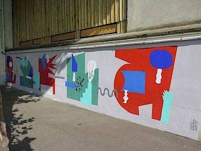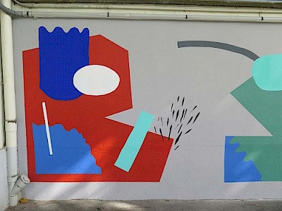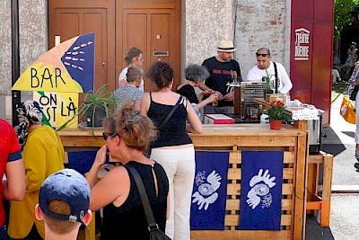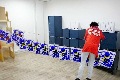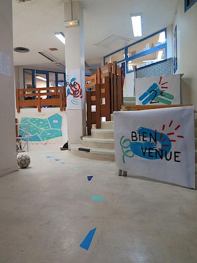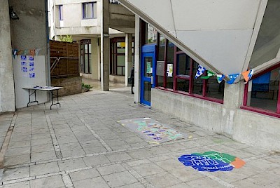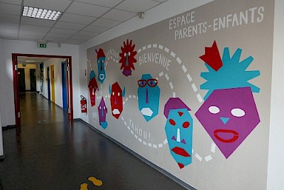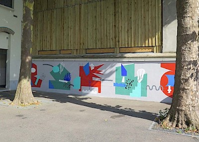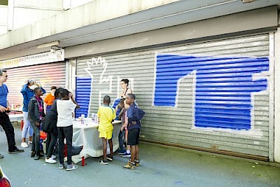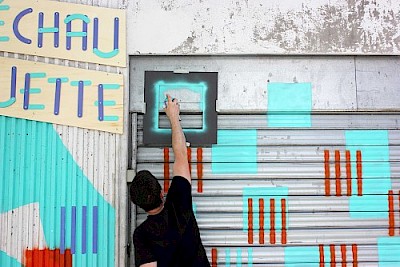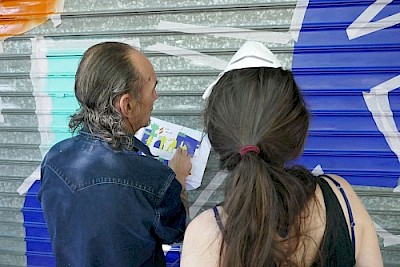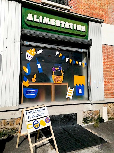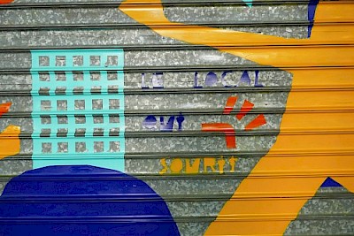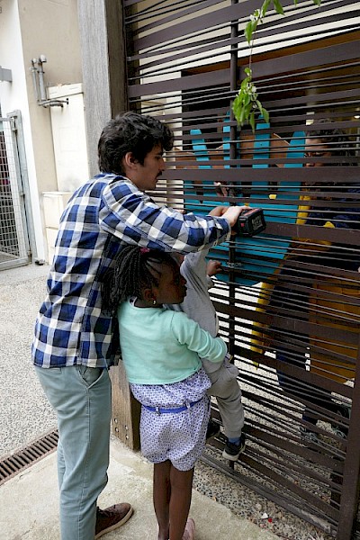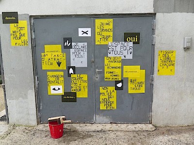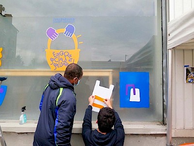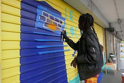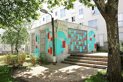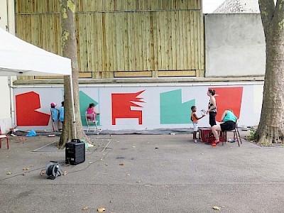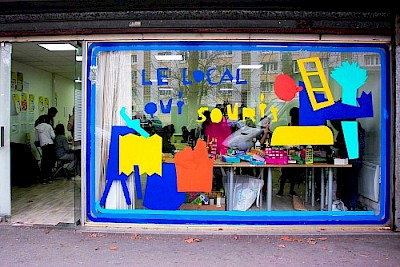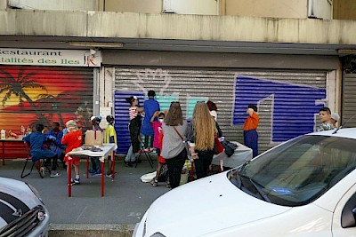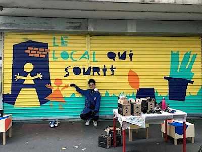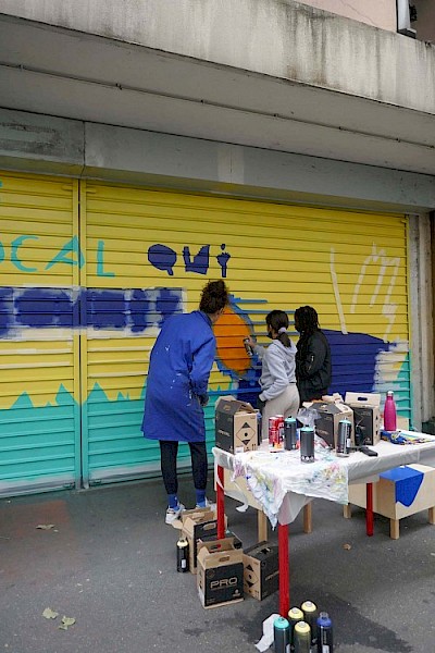 Après un premier travail d’aménagement réalisé en 2019 pour le “Local qui sourit”, notre collectif a mené des ateliers de création avec les usagers et usagères du lieu pour penser la future fresque du rideau de fer. A la suite de ces temps de conception collectifs, nous avons réalisé en ateliers participatifs la fresque qui habille désormais…