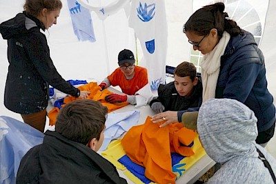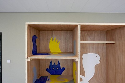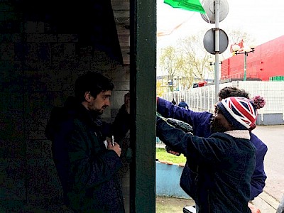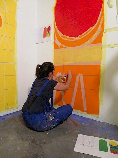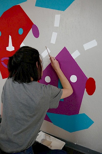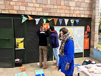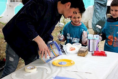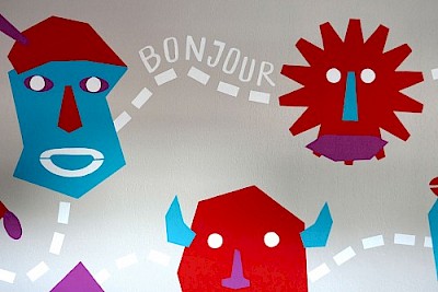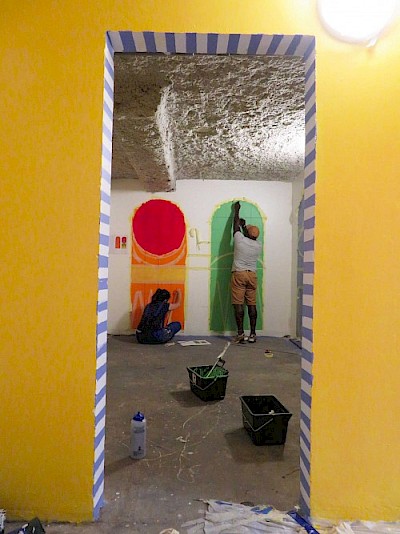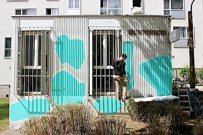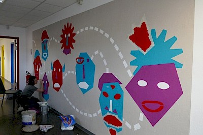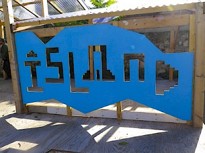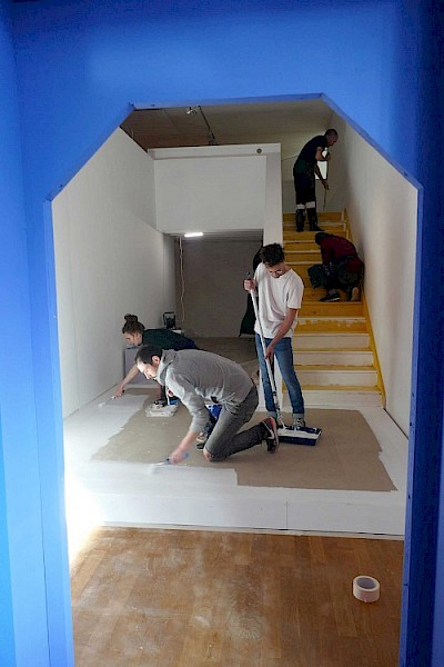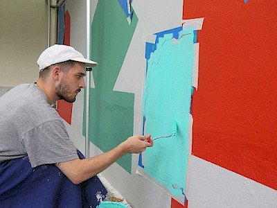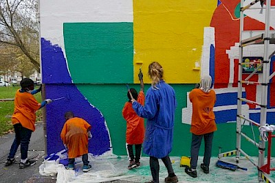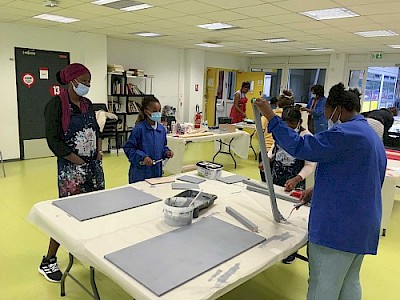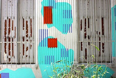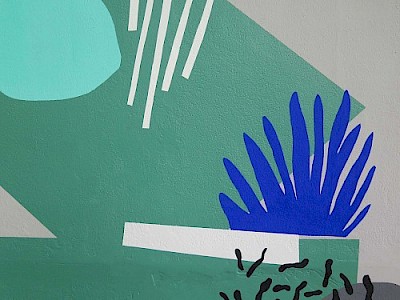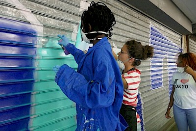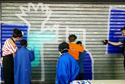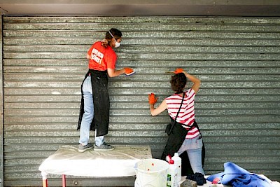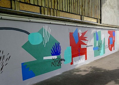 Après un premier travail d’aménagement réalisé en 2019 pour le “Local qui sourit”, notre collectif a mené des ateliers de création avec les usagers et usagères du lieu pour penser la future fresque du rideau de fer. A la suite de ces temps de conception collectifs, nous avons réalisé en ateliers participatifs la fresque qui habille désormais…