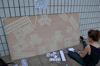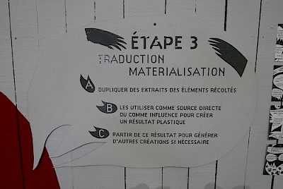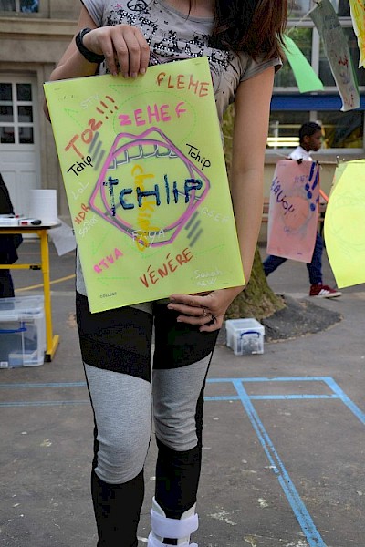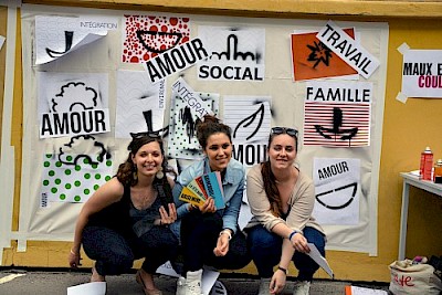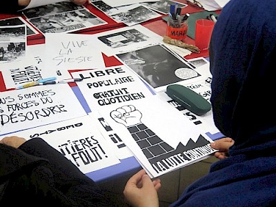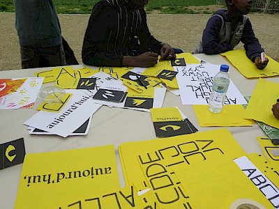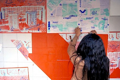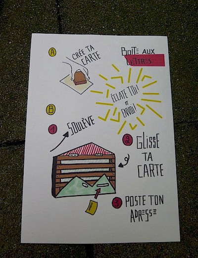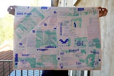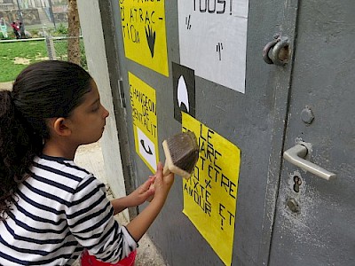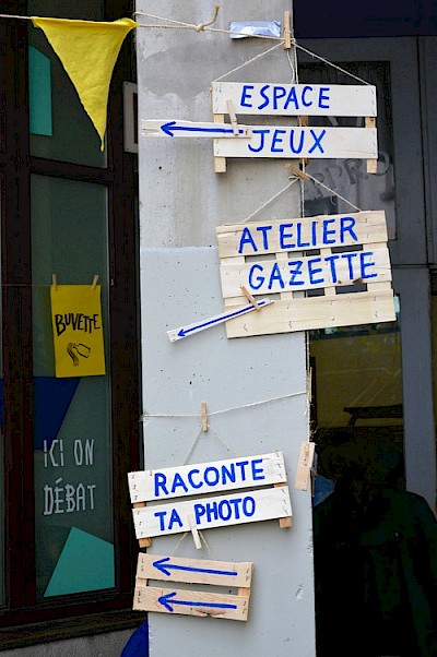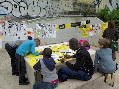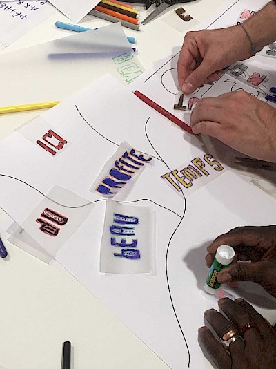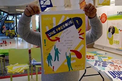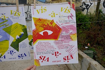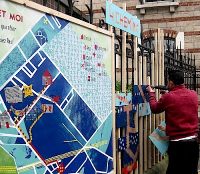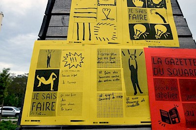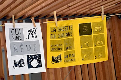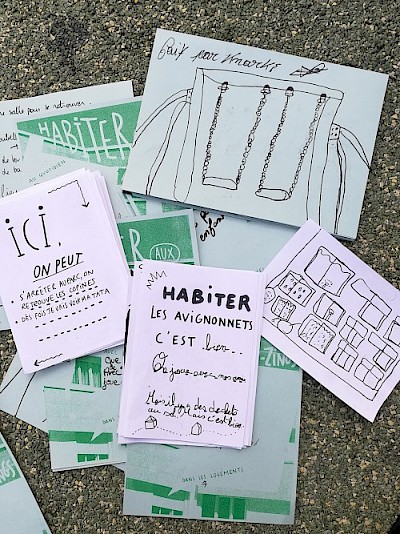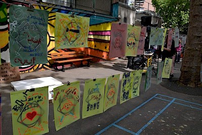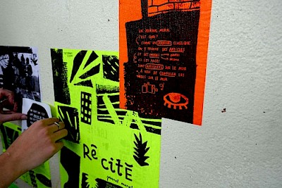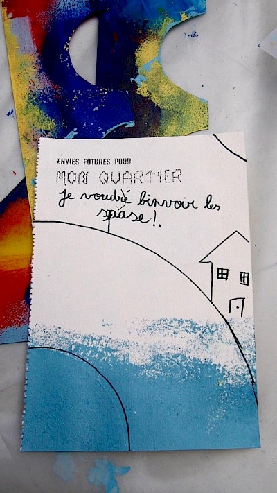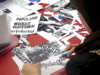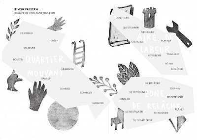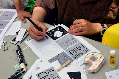 Atelier d'affiches volantes Nous avons proposé un atelier d’affiches où sont mêlées recherche textuelle et création graphique. Autour de la revendication individuelle et collective de la vie du quartier, les participants ont été amenés à débattre et échanger. Ils ont complété ensuite des phrases insolentes et vivantes pour traduire leur envies…