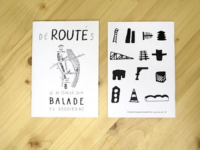 Organisée par Gare au Théâtre, nous avons guidé la balade en Ardoinais en proposant aux participants d'imaginer une fiction. Ceux-ci ont reçu un carnet de découvreurs, avec des exercices visuels proposés au fil du trajet. Nous avons ainsi au fur et à mesure réalisé des interventions graphiques dans l'espace. Nous sommes des découvreurs, déroutés…